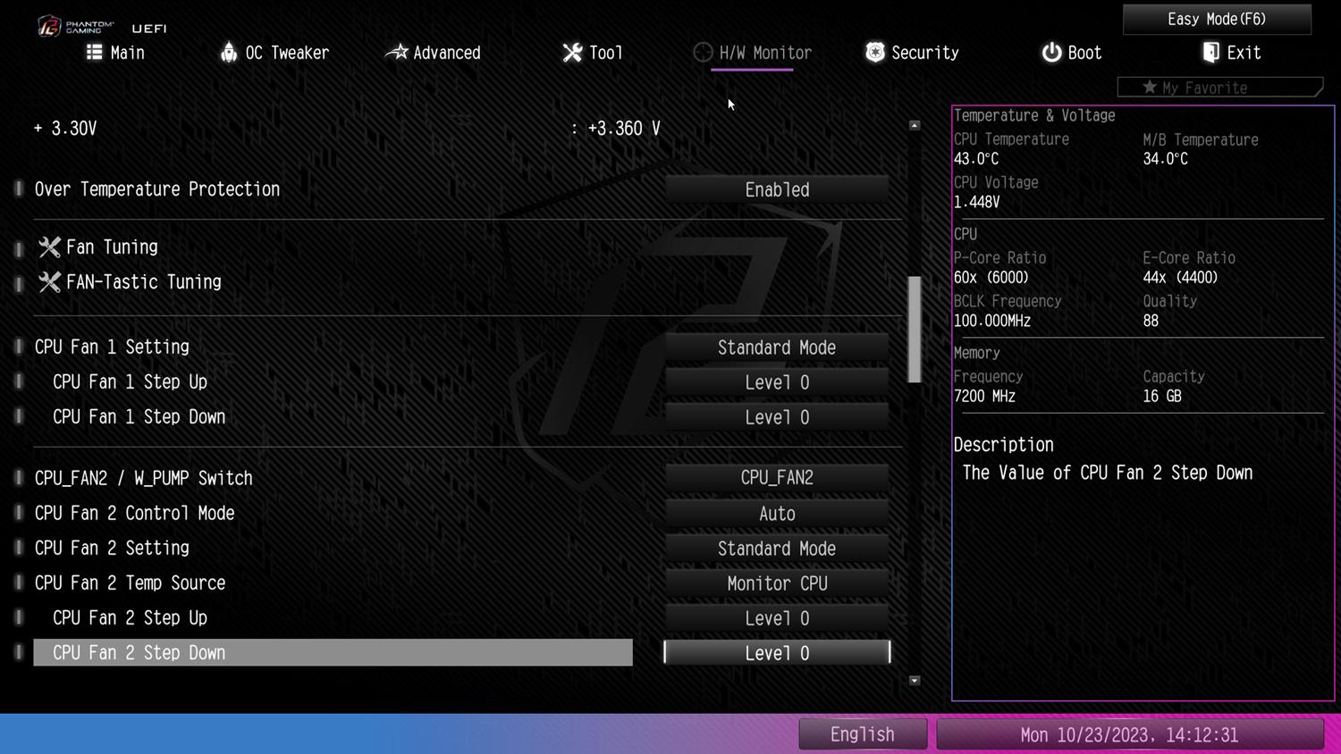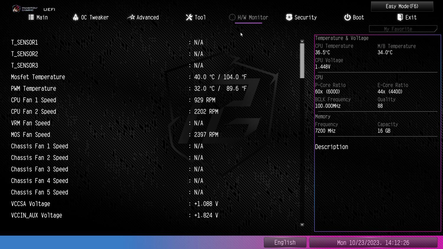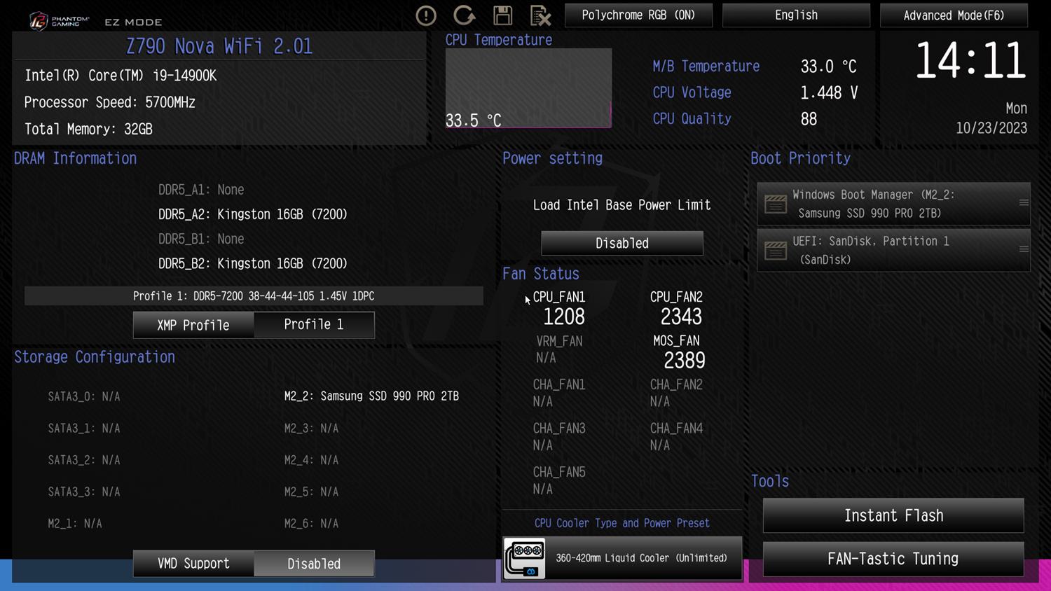 Czujnik wskazywał tutaj 67°C i 70°C. Wentylator ustawiał się na kolejno ok. 3300 RPM i ok. 3600 RPM. Temepratury są więc bardzo dobre i nie ma obaw o przegrzewanie się sekcji. Wentylator przy bardzo cichym zestawie może być słyszalny, ale przy AiO 360, 14900K pod mocnym obciążeniem na pewno nie będzie Wam przeszkadzał. W spoczynku działa on z prędkością ok. 2600 RPM i tutaj jest cichy. Oczywiście jego krzywą możecie zmienić z domyślnej na cichą czy ustawić własną.