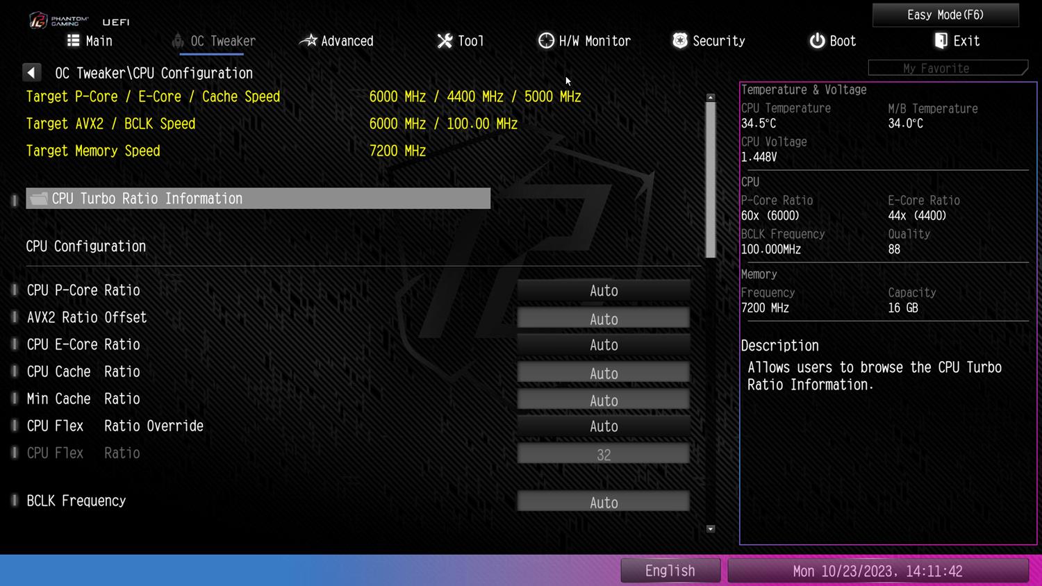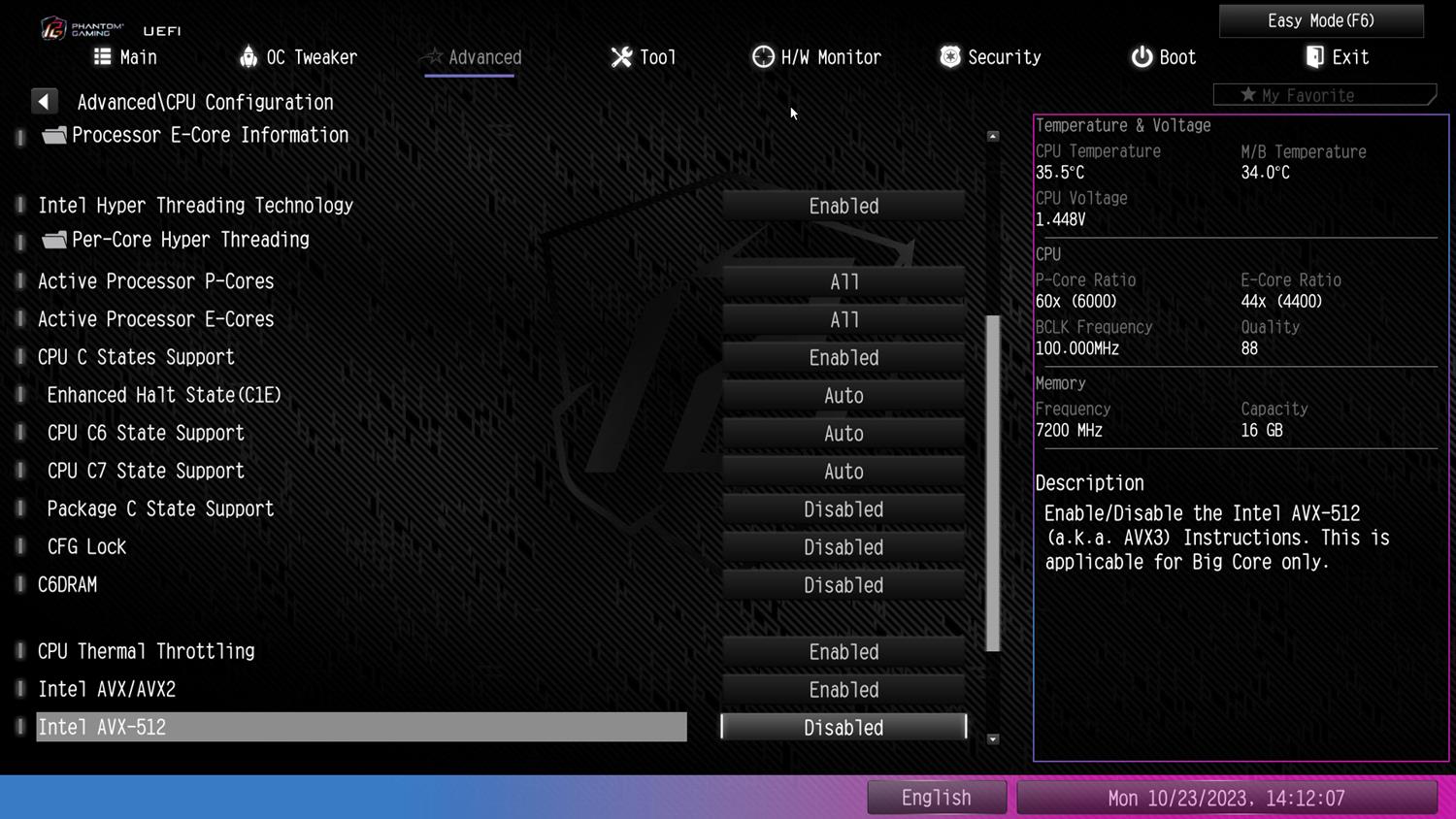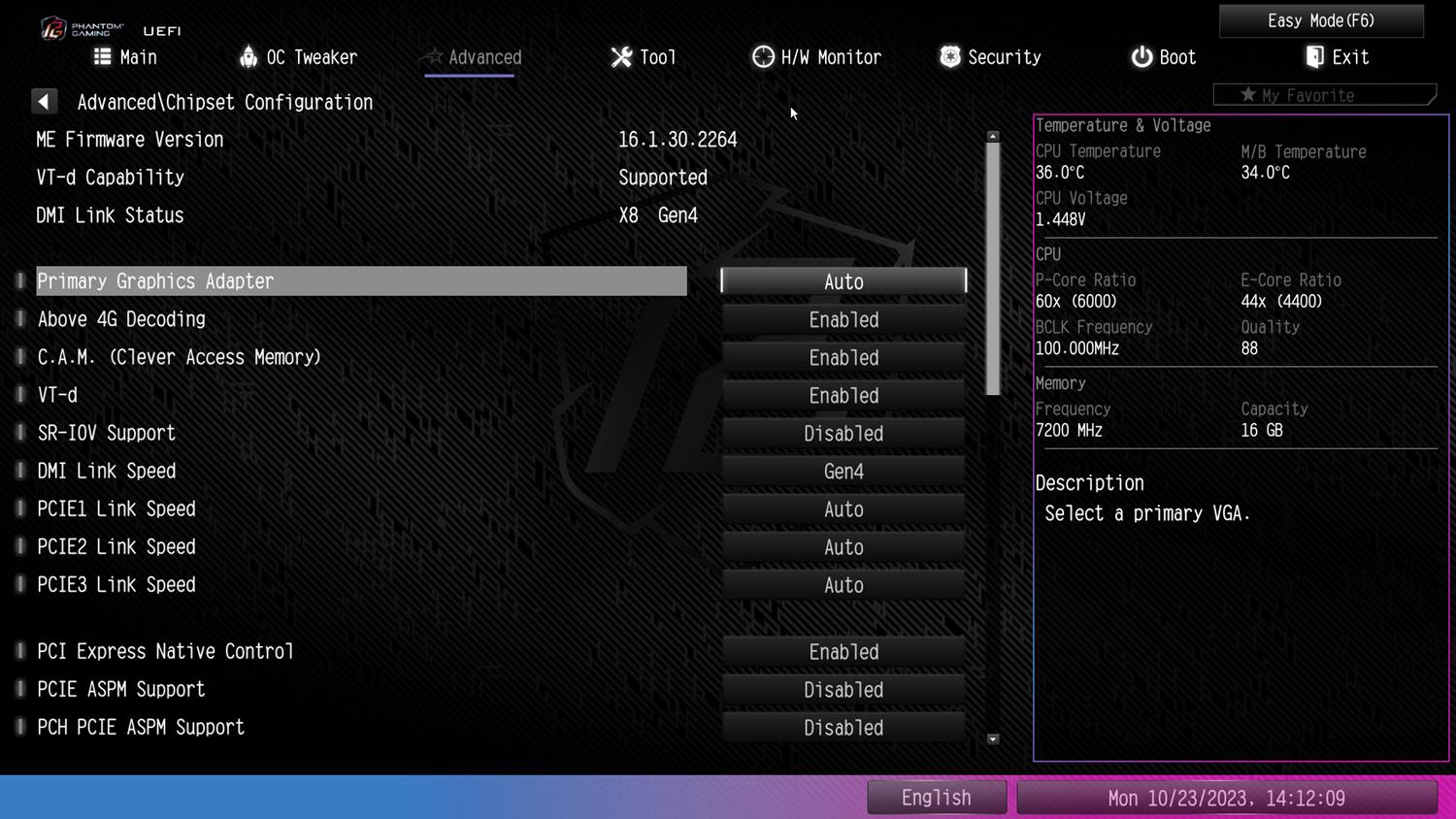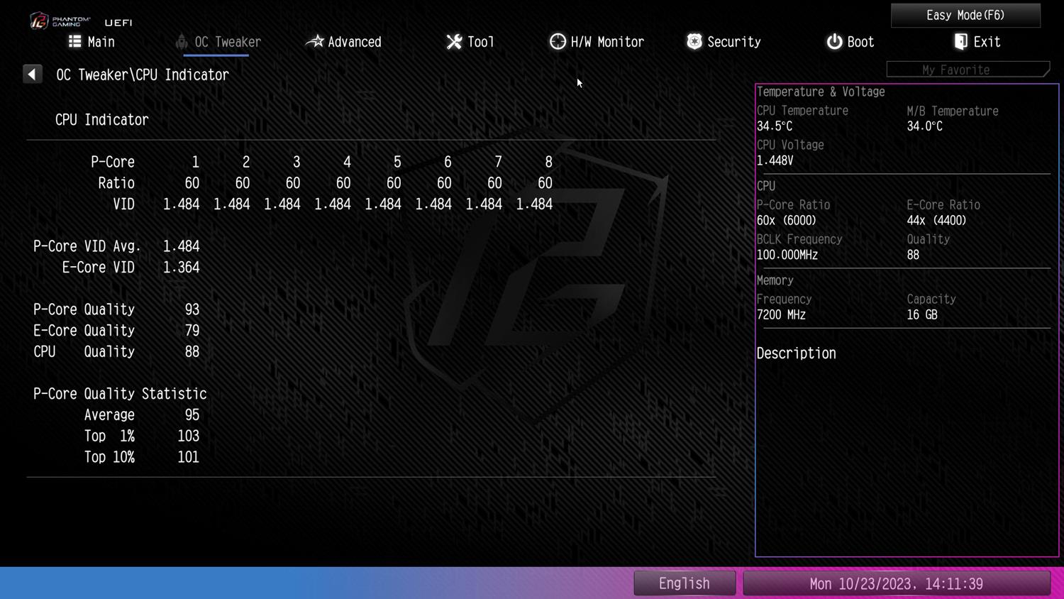 W BIOSie jak zawsze mamy tryb Ez, gdzie łatwo włączycie XMP, sprawdzicie wentylatory czy ustawicie ich krzywą. Jest tez opcja wyboru chłodzenia procesora, od którego zależą limity mocy. Przy 360-420 mamy je zdjęte, 240-280 to 253 W, 120-140 to 180 W, a air cooler to 125 W. Z ciekawych rzeczy jest jeszcze CPU Indicator, który ocenia procesor i podpowiada, czy można z niego więcej wycisnąć. Poza tym wszystkie opcje są ładnie poukładane w zakładkach, procesor można łatwo podkręcić i nie ma problemów ze znalezieniem interesującej nas opcji. Resizable BAR jest też domyślnie włączony. BIOS jest typowy dla firmy, ale ciężko coś jemu zarzucić.