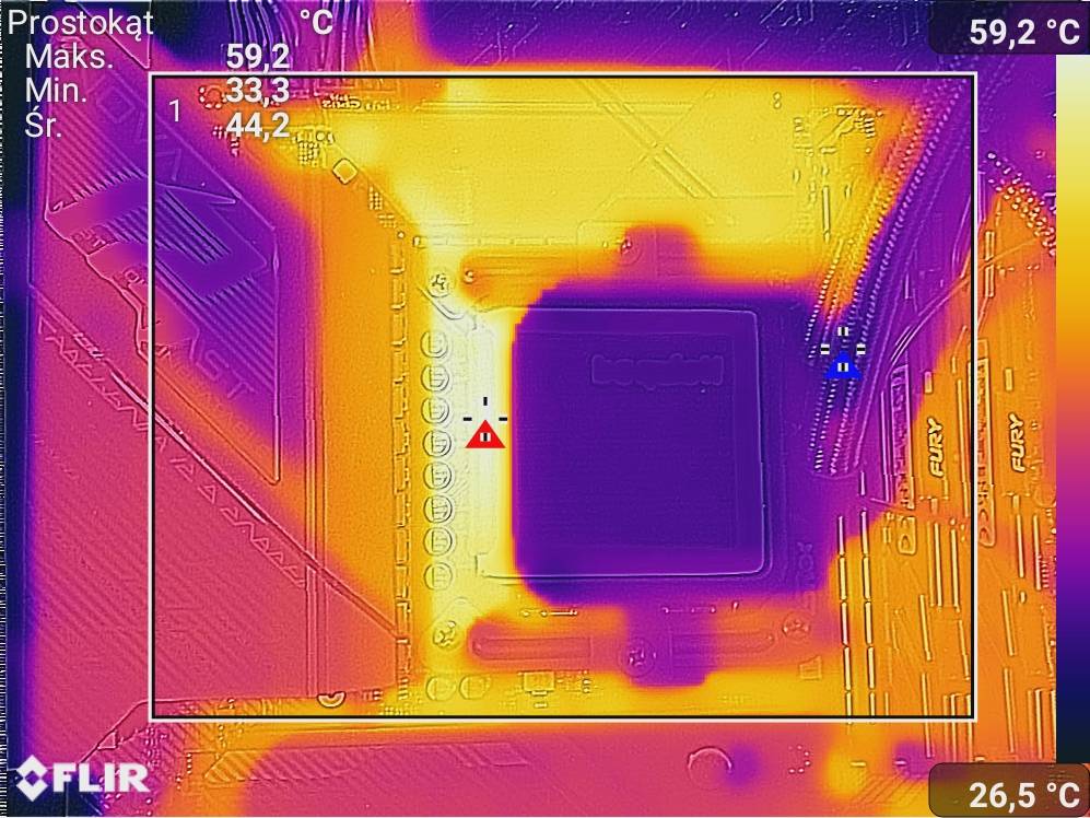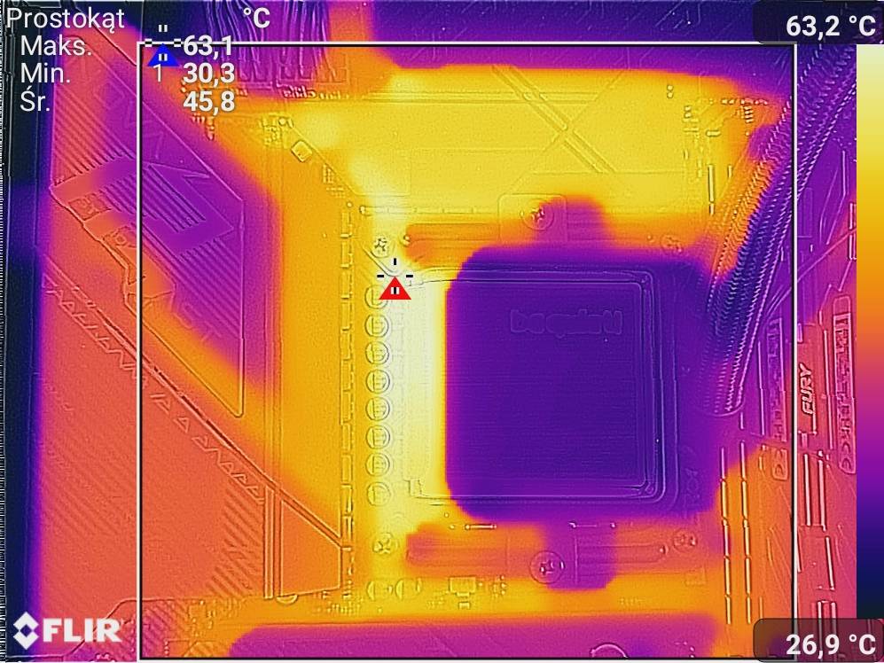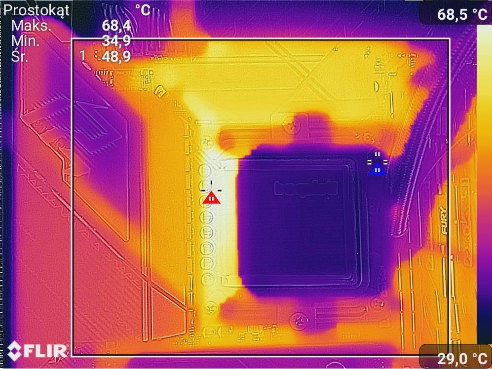 Tutaj czujnik wskazywał 71°C i 76°C. Różnice względem działającego wentylatora nie są więc bardzo duże. Sekcja daje sobie radę również bez niego i jeśli macie obudowę z dobrym przepływem powietrza to możecie rozważyć nawet jego wyłączenie.