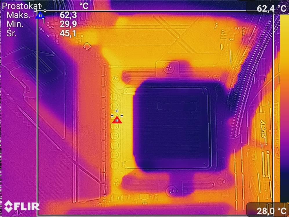 Testy przeprowadziłem przy wykorzystaniu wielowątkowego testu Cinebench 2024, który działał 10 minut. Poniżej możecie zobaczyć zdjęcia termowizyjne wykonane dzięki smartfonowi CAT S61 przed i po OC do 5,8/4,6 GHz.