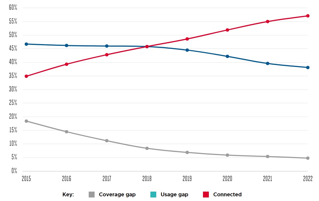 Faktycznie coraz więcej ludzi korzysta z mobilnego internetu, ale według danych GSMA, bez takiego połączenia pozostaje nadal spory odsetek mieszkańców naszej planety (3,4 mld). Co ciekawe, większości z nich nie ogranicza zasięg – mieszka bowiem na obszarach objętych mobilną siecią szerokopasmową. Zjawisko określane jest mianem luki w użytkowaniu. Zmniejszyła się ona nieznacznie w porównaniu do 2021 r (40% globalnej populacji) do 38% w 2022 r., aczkolwiek nadal pozostaje znaczna. Dla porównania, tylko 5% osób nie korzystających z mobilnego internetu mieszka na obszarach bez zasięgu mobilnej sieci szerokopasmowej – to już tzw. luka w zasięgu.