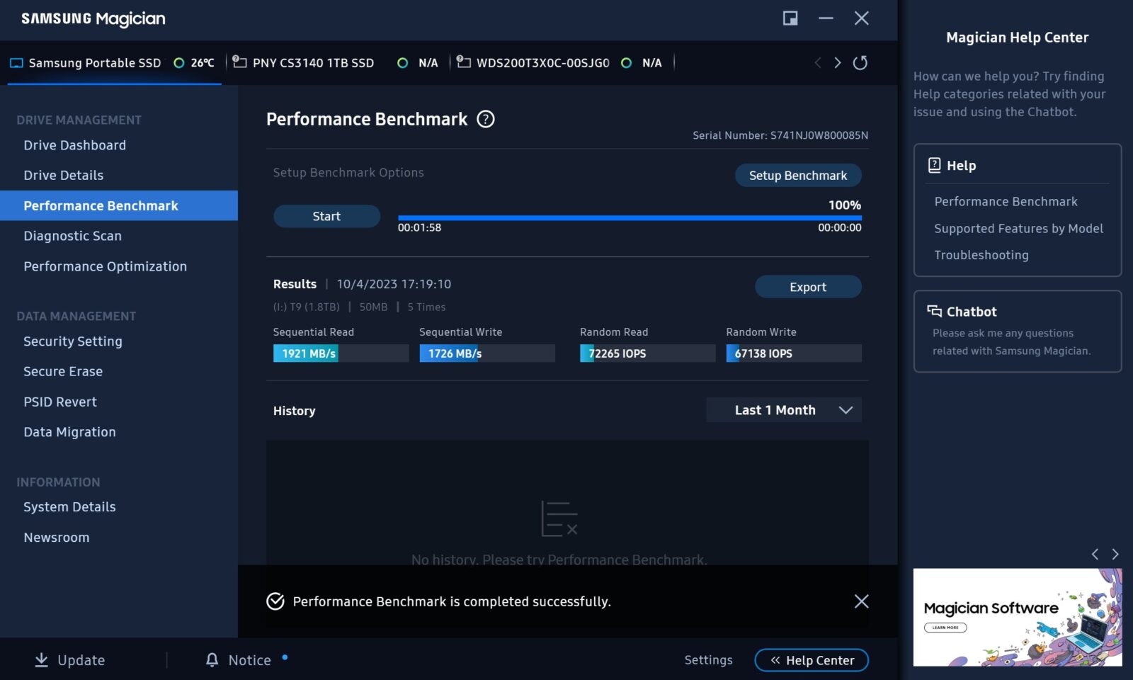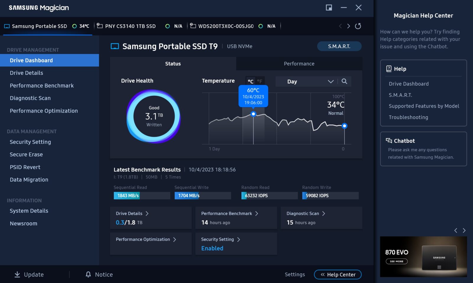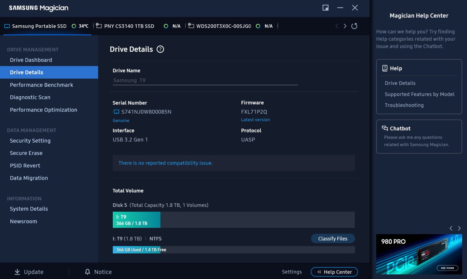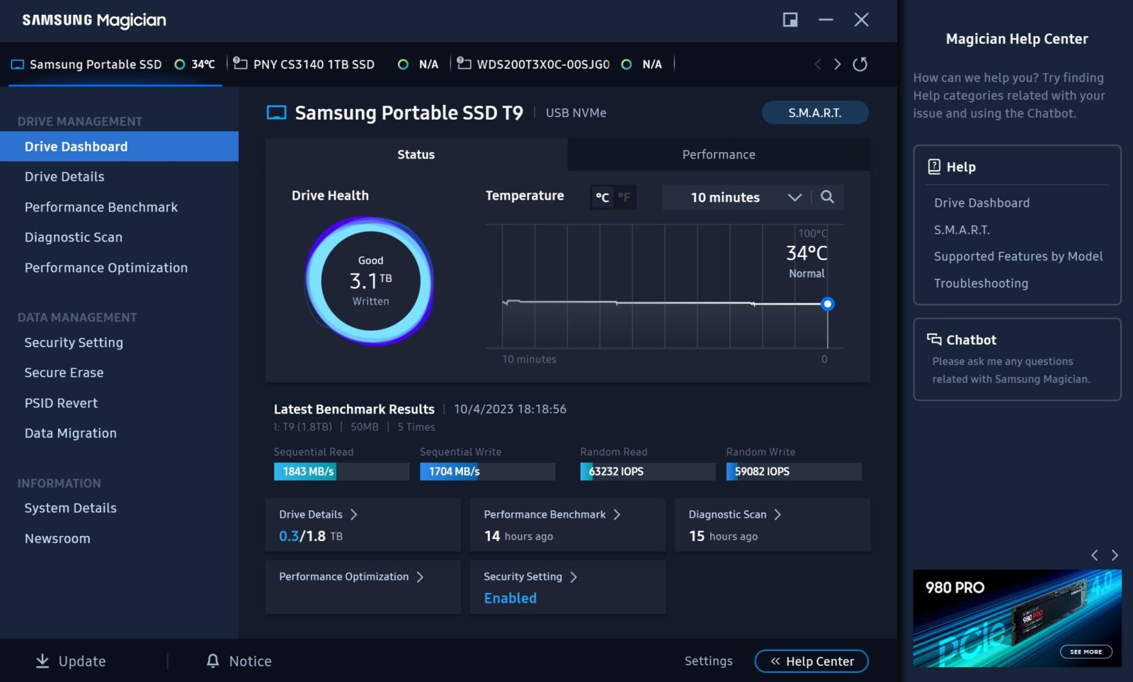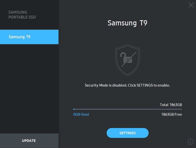 Na sam koniec warto też wspomnieć, że Samsung T9 wspiera dwa programy – Portable SSD oraz Magician, które to umożliwiają podejrzenie temperatury i aktywację trybu szyfrowania AES-256 realizowanego na poziomie hardware. Ten drugi program dodatkowo umożliwia przeprowadzanie testów i podejrzenie dysku pod kątem parametrów SMART. Innymi słowy, włączycie je zapewne najpierw po to, aby włączyć tryb szyfrowania i ustawić hasło, a później już o nich zapomnicie… aż do wystąpienia pierwszych problemów z dyskiem, których powód możecie znaleźć w programie Magician.