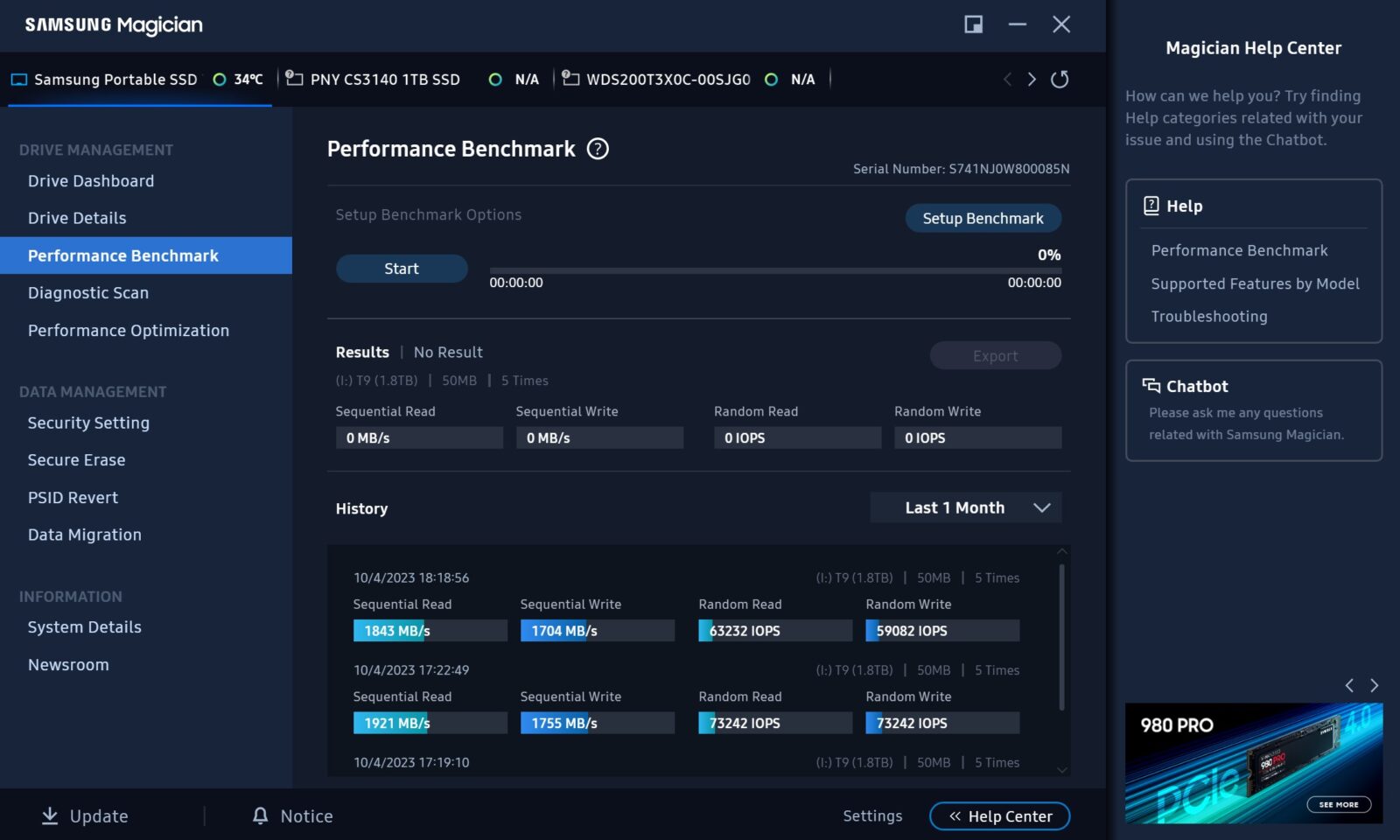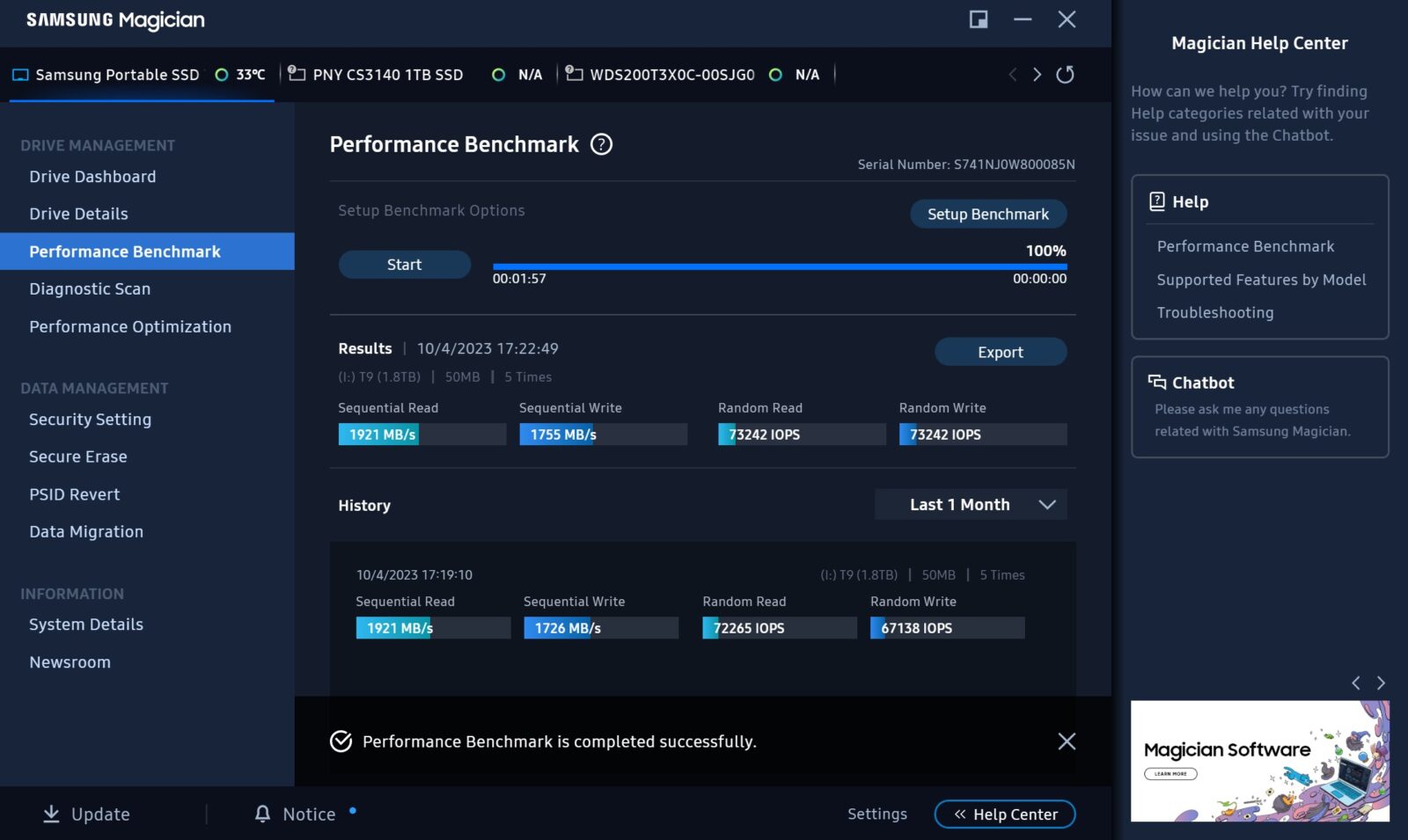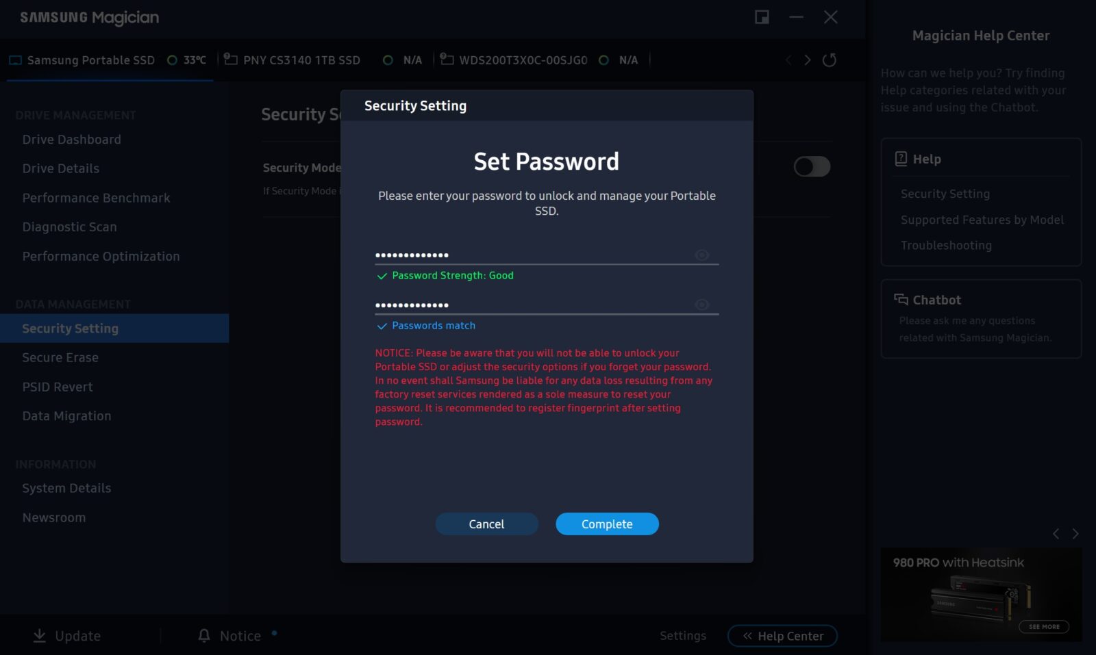 Na sam koniec warto też wspomnieć, że Samsung T9 wspiera dwa programy – Portable SSD oraz Magician, które to umożliwiają podejrzenie temperatury i aktywację trybu szyfrowania AES-256 realizowanego na poziomie hardware. Ten drugi program dodatkowo umożliwia przeprowadzanie testów i podejrzenie dysku pod kątem parametrów SMART. Innymi słowy, włączycie je zapewne najpierw po to, aby włączyć tryb szyfrowania i ustawić hasło, a później już o nich zapomnicie… aż do wystąpienia pierwszych problemów z dyskiem, których powód możecie znaleźć w programie Magician.