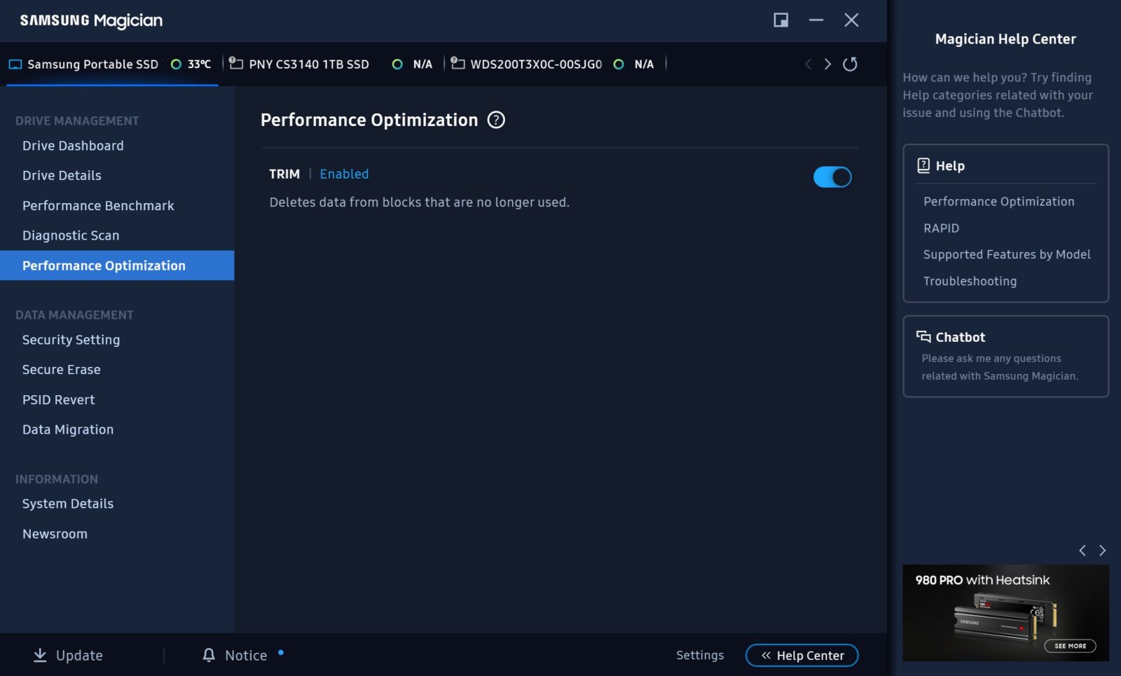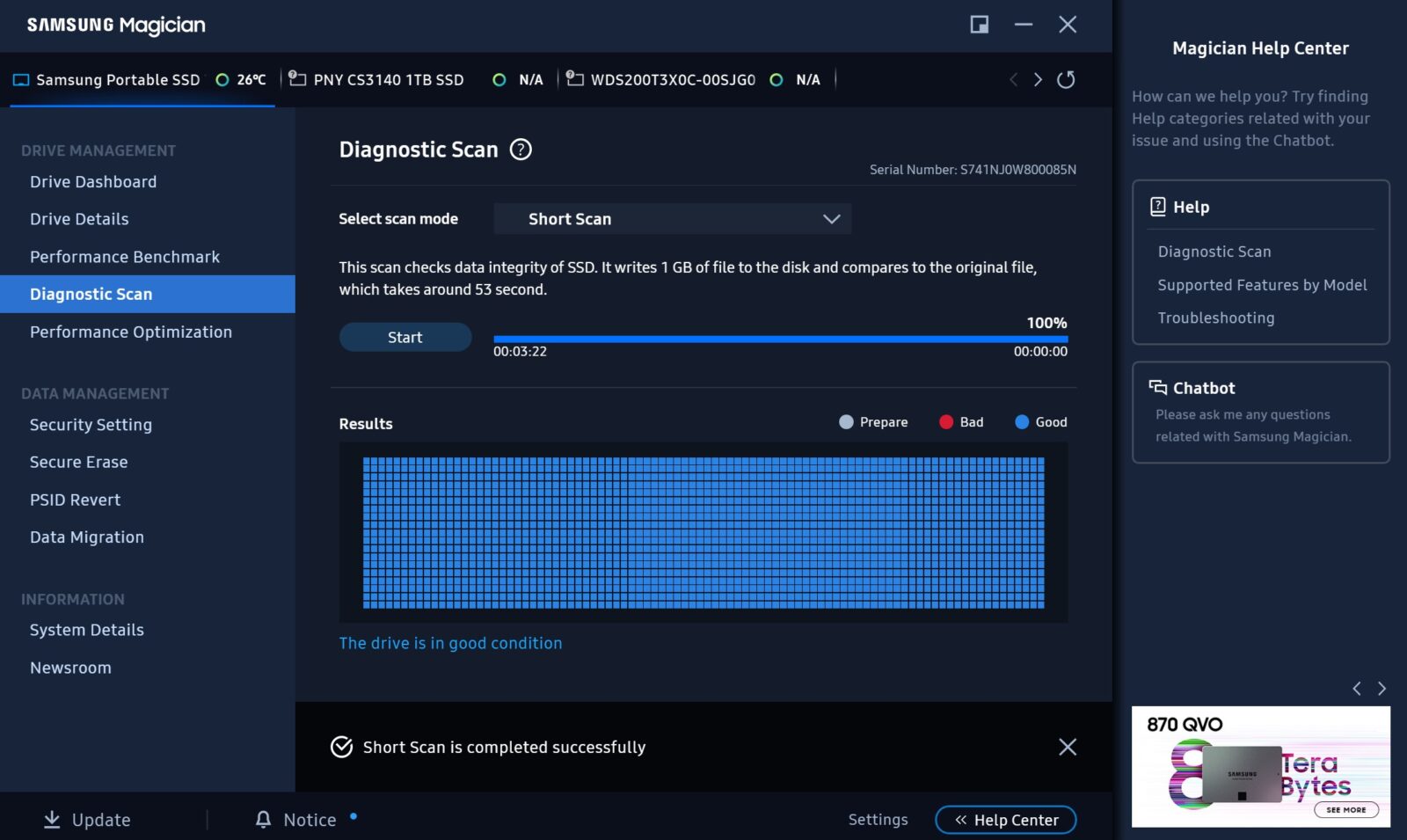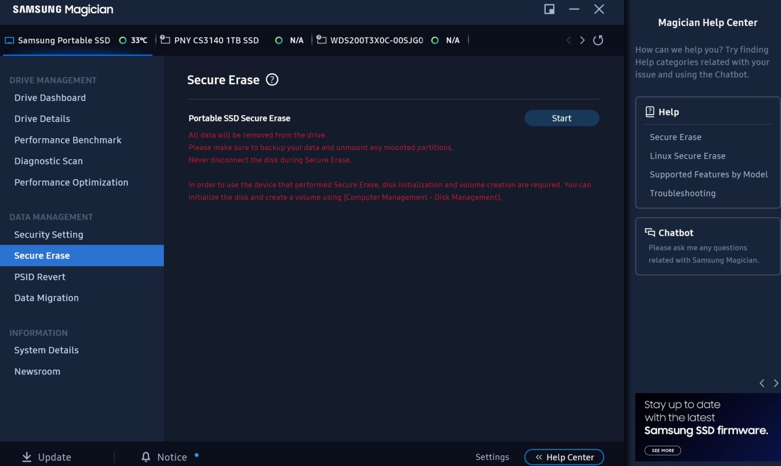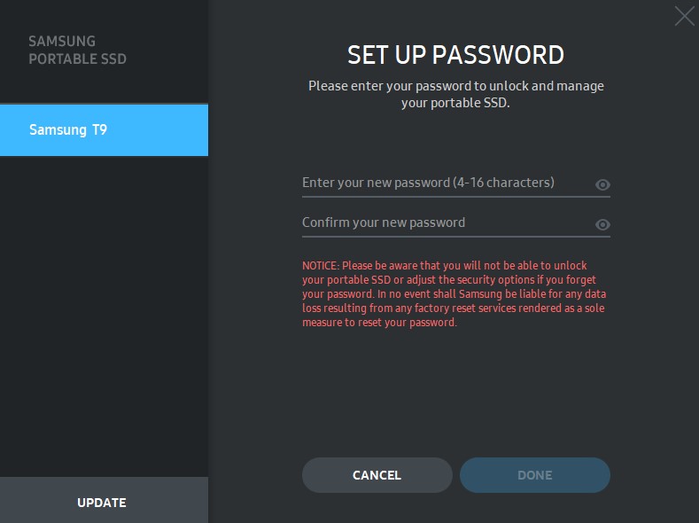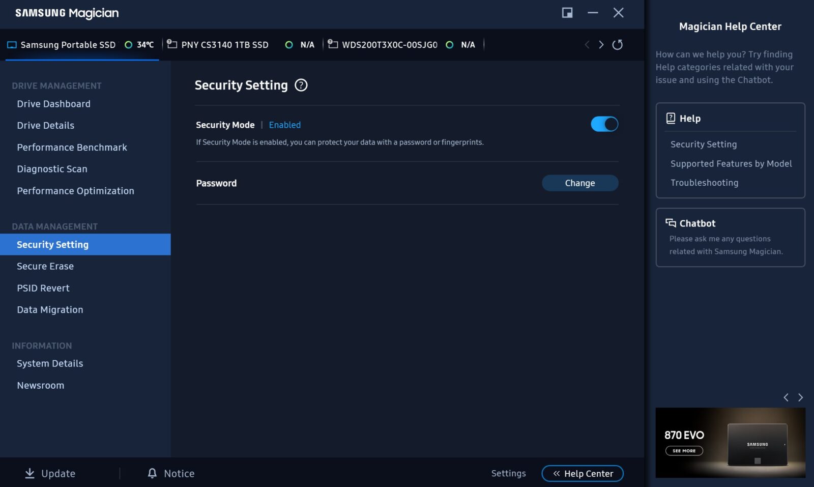Na sam koniec warto też wspomnieć, że Samsung T9 wspiera dwa programy – Portable SSD oraz Magician, które to umożliwiają podejrzenie temperatury i aktywację trybu szyfrowania AES-256 realizowanego na poziomie hardware. Ten drugi program dodatkowo umożliwia przeprowadzanie testów i podejrzenie dysku pod kątem parametrów SMART. Innymi słowy, włączycie je zapewne najpierw po to, aby włączyć tryb szyfrowania i ustawić hasło, a później już o nich zapomnicie… aż do wystąpienia pierwszych problemów z dyskiem, których powód możecie znaleźć w programie Magician.
