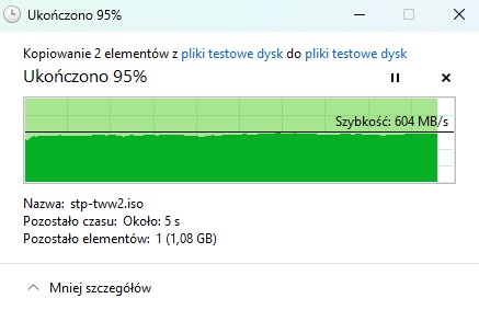 Mniejsze paczki plików, mniej rozbudowane projekty i prostsze gry są kopiowane i wczytywane bez aż tak wielkiej różnicy względem wewnętrznego dysku, co samo w sobie jest cenne. Trudno zresztą znaleźć na rynku wydajniejsze zewnętrzne dyski SSD w formacie odpowiadającym modelowi Samsung T9, bo choć oczywiście ten nie ma podejścia do np. WD_BLACK D50 Game Dock 2 TB w kwestii wydajności, ale są to dwie zupełnie inne klasy sprzętu.