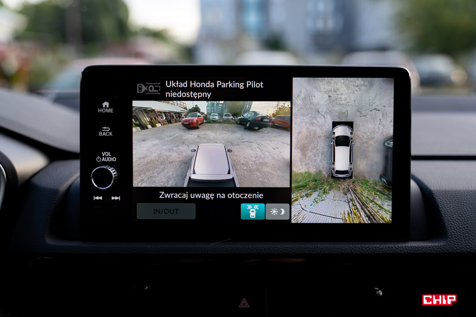 Dodatkową zaletą tak skonstruowanego systemu jest możliwość wprowadzenia asystenta parkowania i takowy w CR-V Plug-In znajdziemy. Przetestowaliśmy go kilkukrotnie, więc mogę Wam co nieco na jego temat powiedzieć. Pierwszy plus należy mu się za to, że sprawnie wyszukuje miejsca parkingowe. Kiedy już jakieś znajdzie, w zależności od tego co znajdzie, albo sam zaproponuje Wam metodę parkowania, albo zapyta, w jaki sposób ma zaparkować (prostopadle/równolegle). Kolejna pochwała należy mu się za to, że zajmie się nie tylko odpowiednim ustawieniem kierownicy, będzie również sam zmieniał tryb jazdy (przód/tył) i dokonywał ewentualnych korekt, jeśli nie uda mu się zmieścić na miejscu parkingowym przy pierwszej próbie. Jego jedynym minusem jest zbytnia ostrożność. Kiedy już wybierzecie miejsce i oddacie kontrolę, CR-V potrafi wziąć zajazd godny 6-metrowej limuzyny. Kolejnym mankamentem jest to, że pomimo tak dużych zajazdów, CR-V zazwyczaj nie udaje się zgrabnie zmieścić w miejscu parkingowym przy pierwszym podejściu i będzie wykonywała minimum jedną korektę. Samo wjeżdżanie w miejsce parkingowe jest powolne, ale tego akurat nie postrzegam jako wady – zbyt wiele razy miałam duszę na ramieniu, kiedy auta innych marek pchały się w miejsca parkingowe na wariata, aby nie docenić stoicyzmu Hondy. Summa summarum asystenta zaliczam na plus – jest to pierwsze podejście Hondy do tego typu systemu, więc elementy, które w tej chwili zgrzytają, z pewnością zostaną poprawione, a proces parkowania – usprawniony.