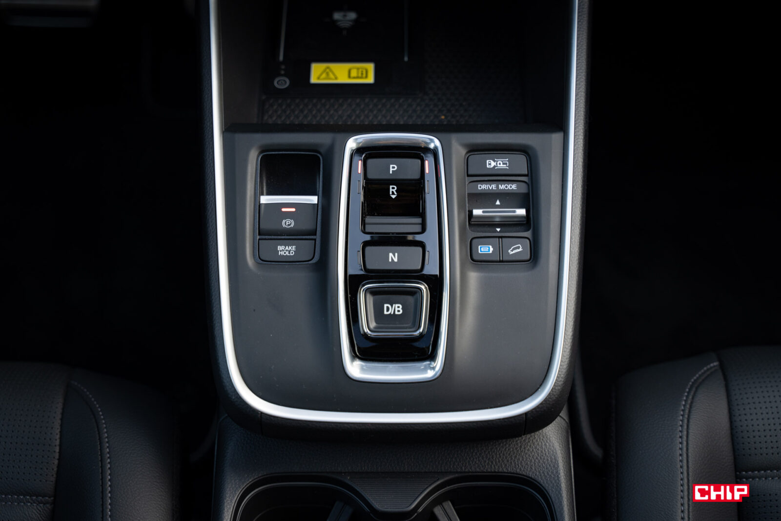 Jest jeszcze jeden przełącznik, służący do wyboru sposobu wykorzystania akumulatora, ale o tym przeczytacie za chwilę. Biorąc to wszystko pod uwagę, do jazdy CRV wystarczy Wam jedna noga, jedna ręka i znajomość oznaczeń D (Drive), R (Reverse) i P (Park), żebyście wiedzieli, które przyciski wciskać.