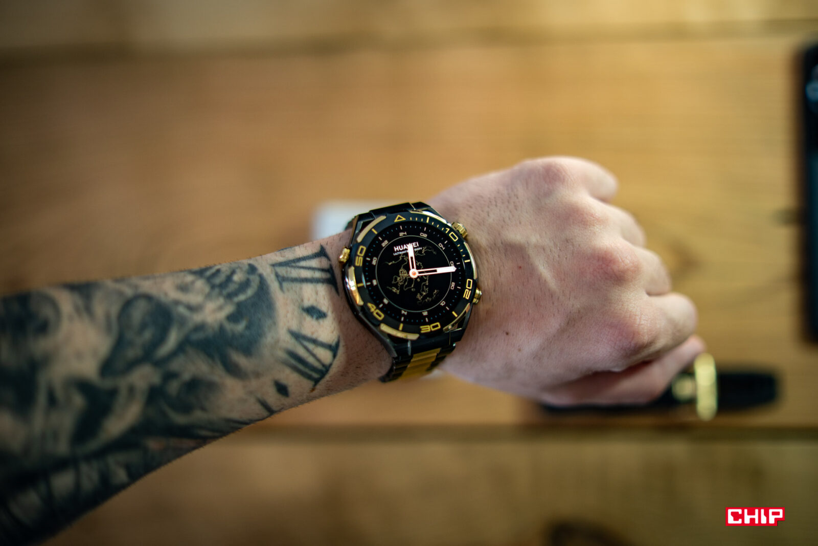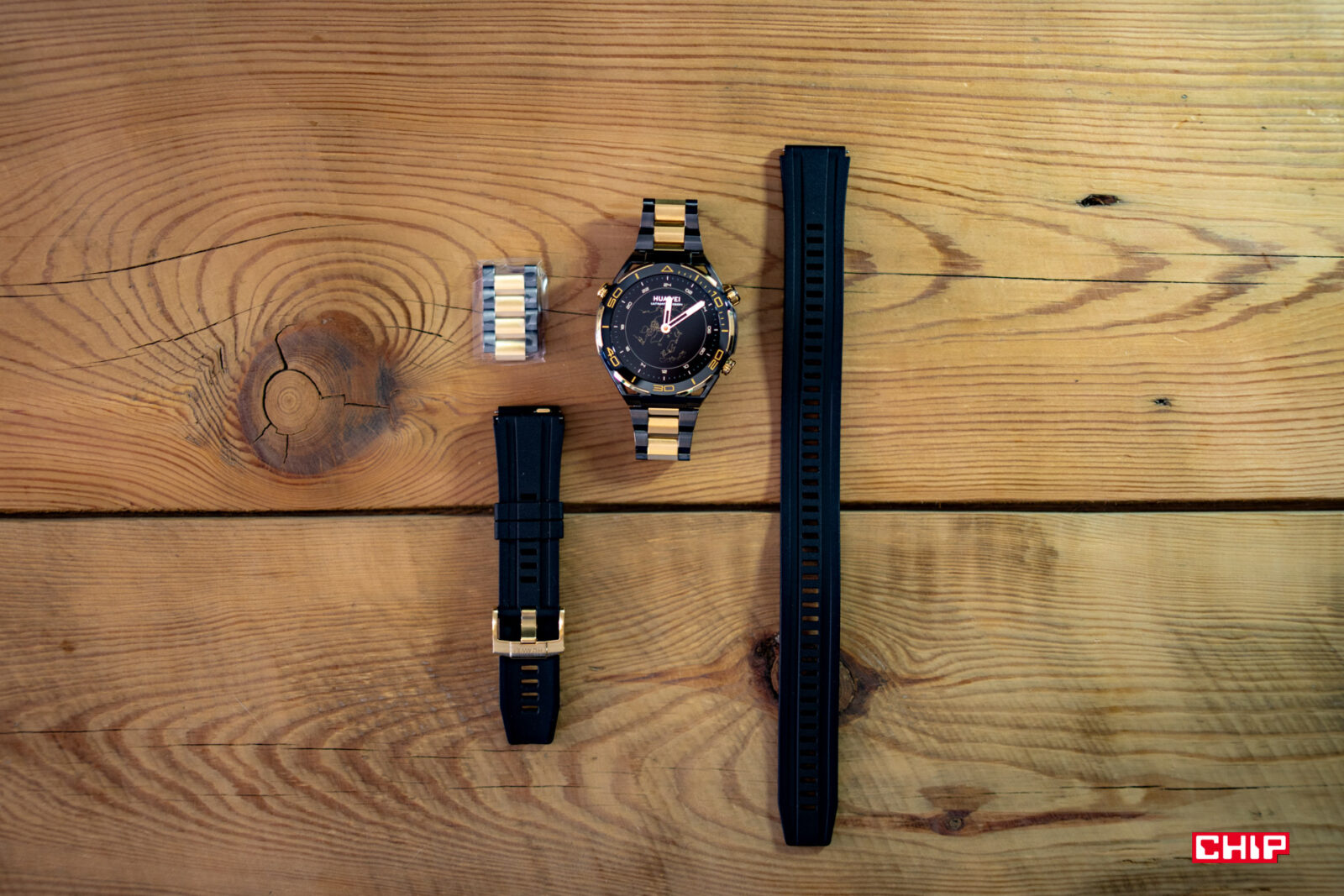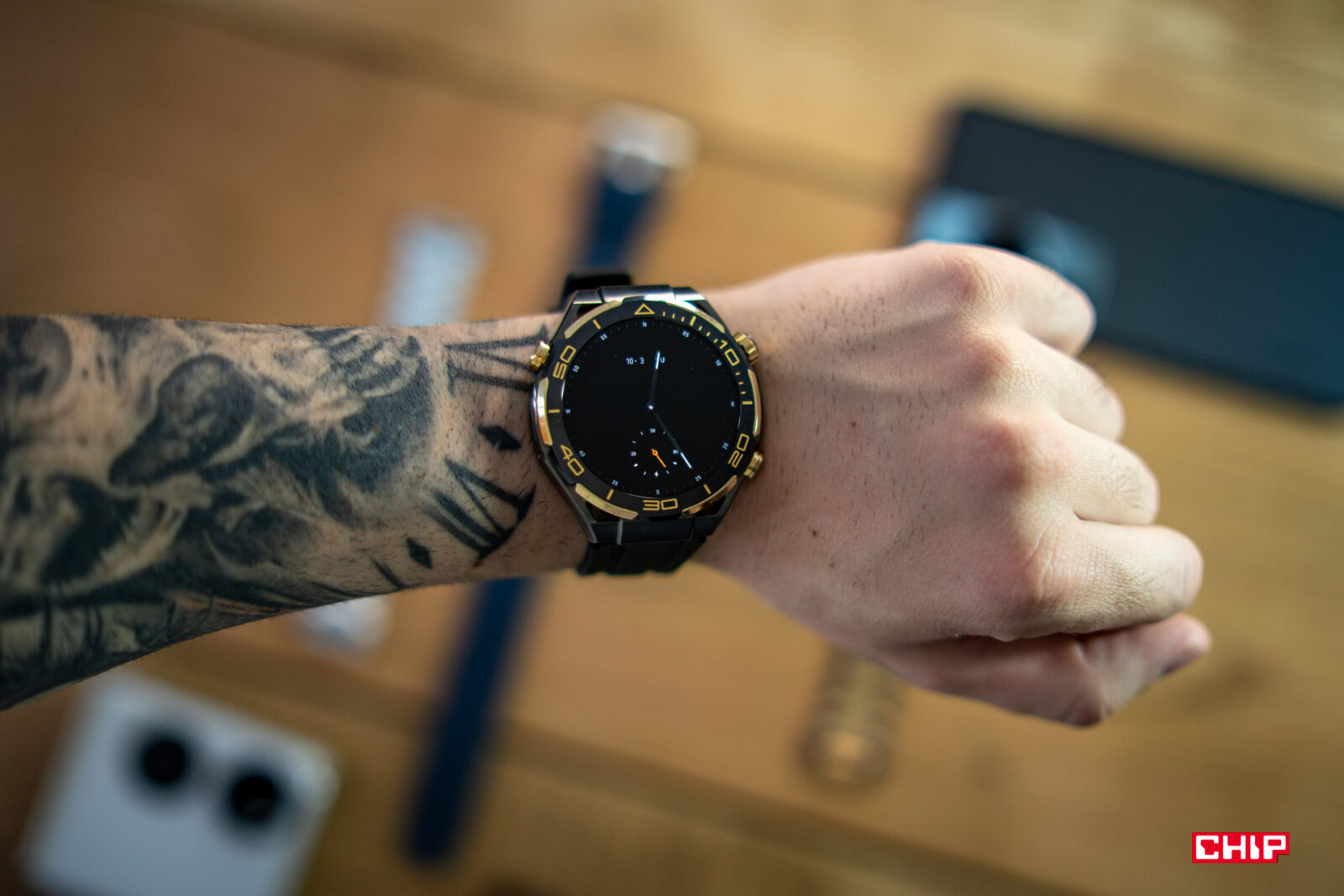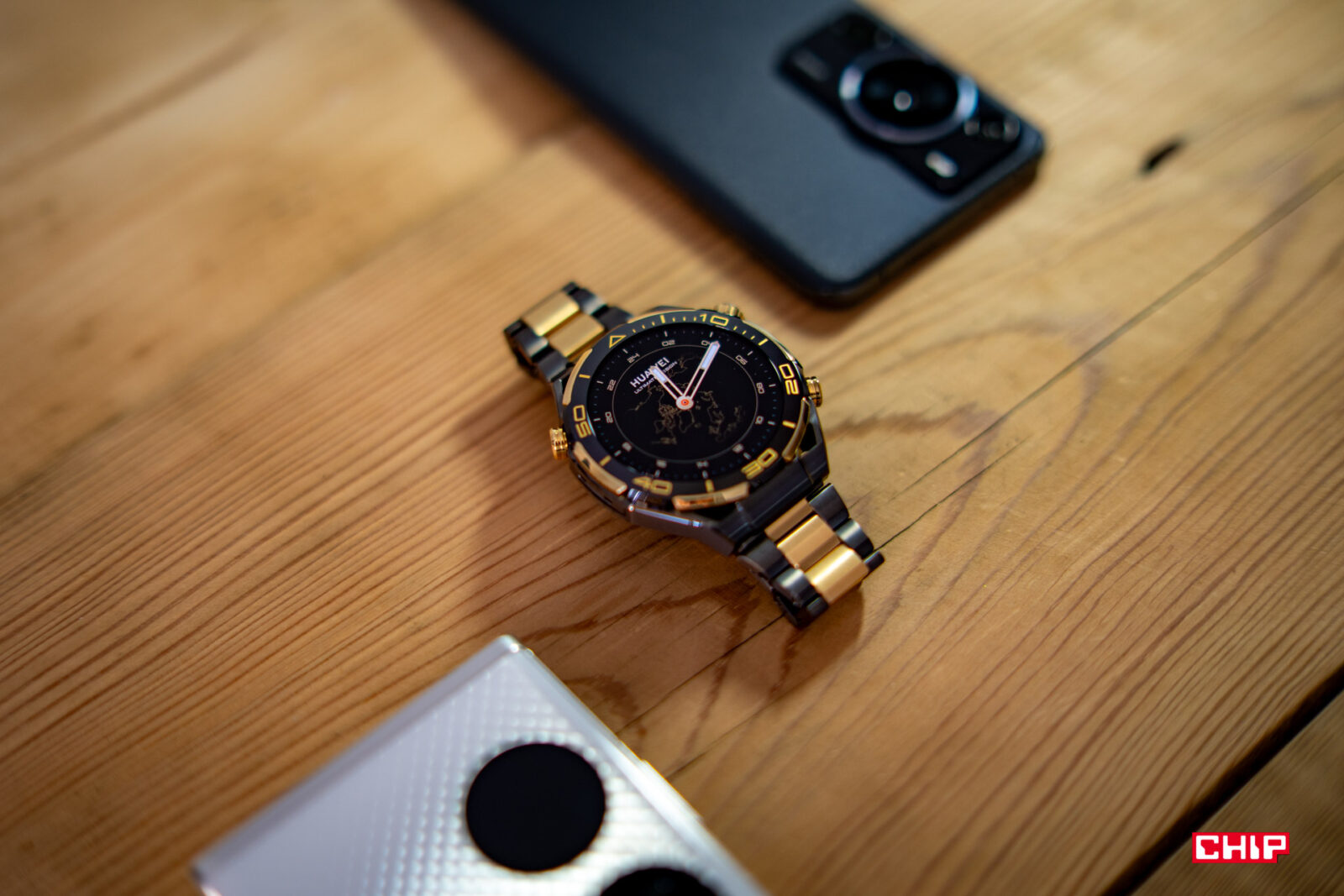Piszę kolejne zdania i tak zerkam nieco w lewą stronę, gdzie leży Huawei Watch Ultimate Design, podstawowy Watch Ultimate, a obok nich Watch GT 4. Wiele osób powie, że bluźnię, ale nie do końca jestem fanem wyglądu Watcha Ultimate. Bardzo doceniam jego wykonanie, rozmiar i niską masę, ale wizualnie bliżej mi do modelu Watch GT 4. Za to im dłużej patrzę na Ultimate Design, tym bardziej mi się podoba. Złote wstawki nie są nachalne i prezentują się bardzo dobrze. Zdecydowanie chętniej sięgnąłbym po tak złocony zegarek, niż po cały pomalowany na złoto, jak choćby w przypadku G-Shocka, którego testowałem jakiś czas temu.