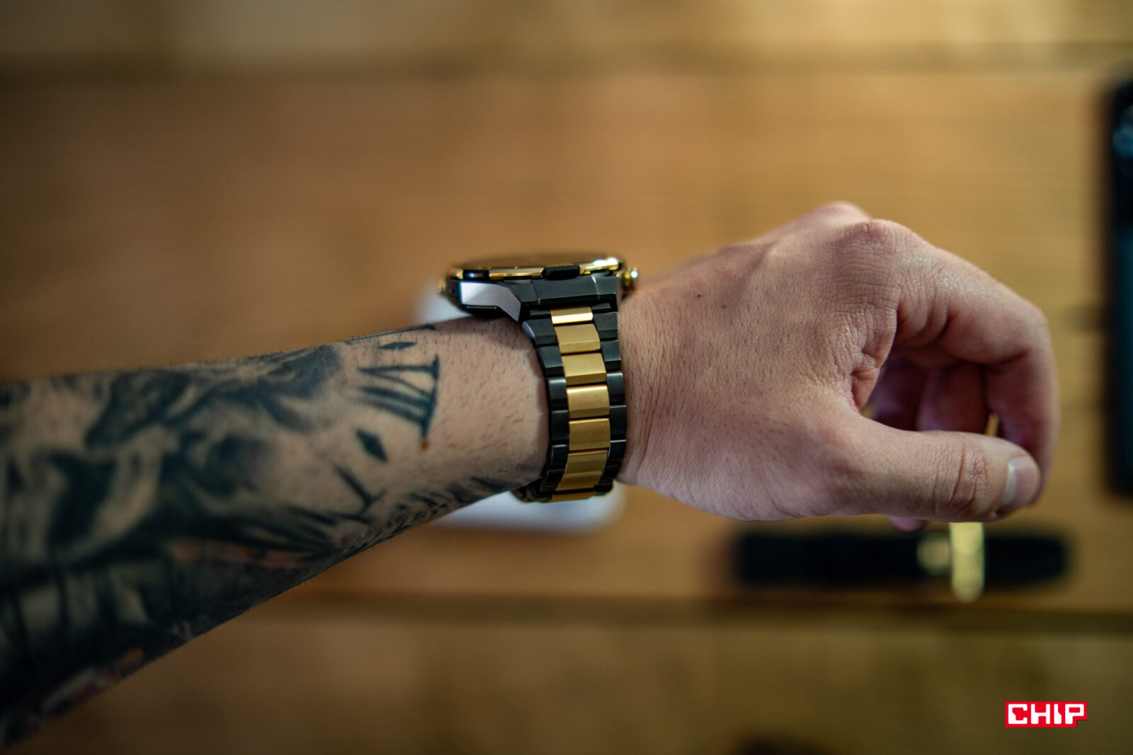 Pierwsza myśl? Złote, tandetne, drogie, przesada… Przyznam, że to bardzo szybko mija po wzięciu zegarka do ręki. Następuje zaciekawienie i oglądanie obudowy z bliska, przyglądanie się każdemu elementowi. Nie można mu odmówić jakości wykonania, bo precyzja docięcia elementów i spasowanie są perfekcyjne.