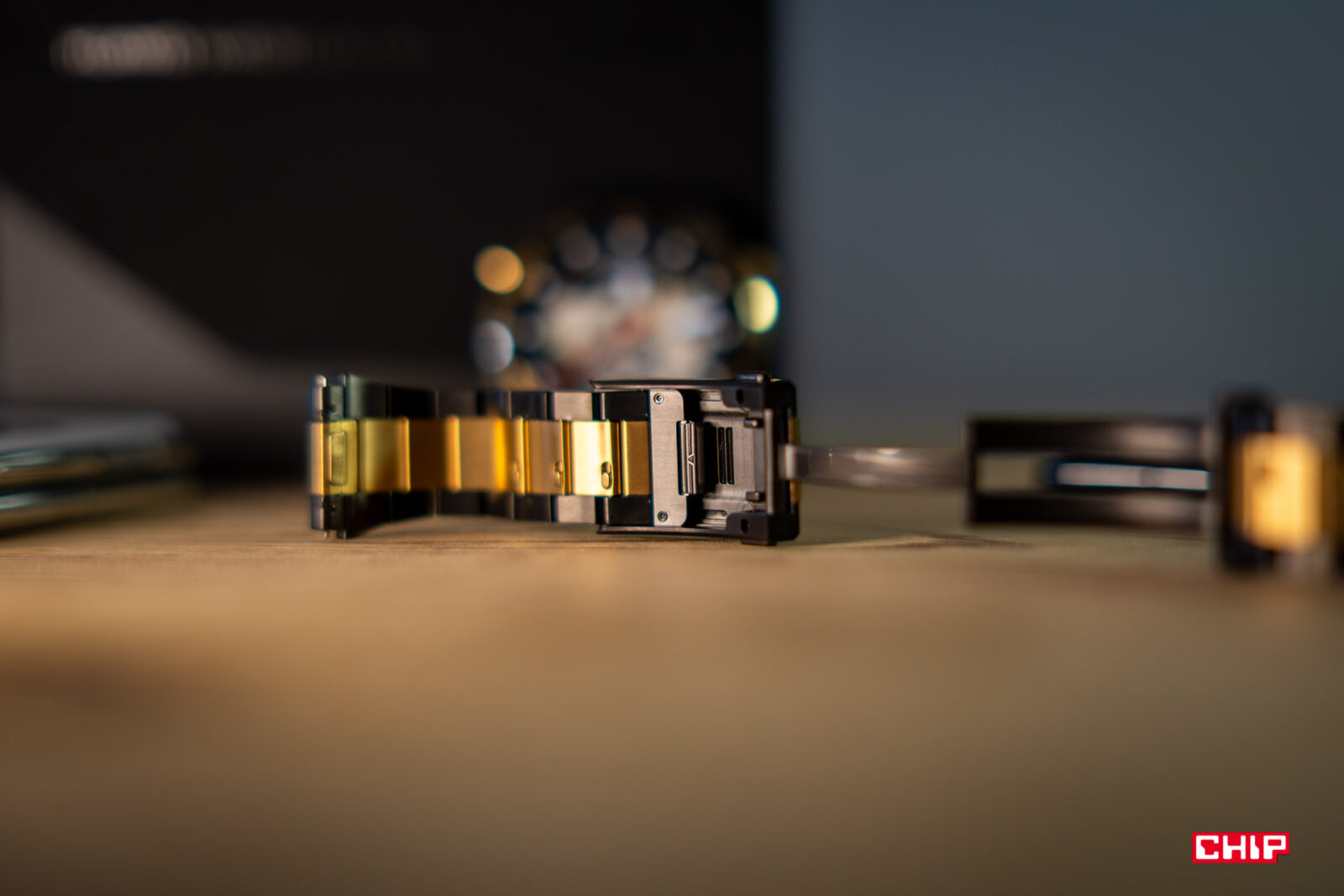Bransoleta nie jest złota, za to jest pokryta złotym pyłem… farbą? Ogółem nie jest to złoto, tylko złoty kolor. Sama bransoleta jest tytanowa i ma świetnie rozwiązaną regulację długości. Zamiast zdejmować ogniwa bransolety, wystarczy zmienić jej szerokość pod zapięciem. Regulacja jest bardzo precyzyjna, bo co 1,45 mm i do dyspozycji mamy 12 progów regulacji. Pierwszy raz wyjąłem z pudełka zegarek z bransoletę i nie musiałem zdejmować w nim ogniw.