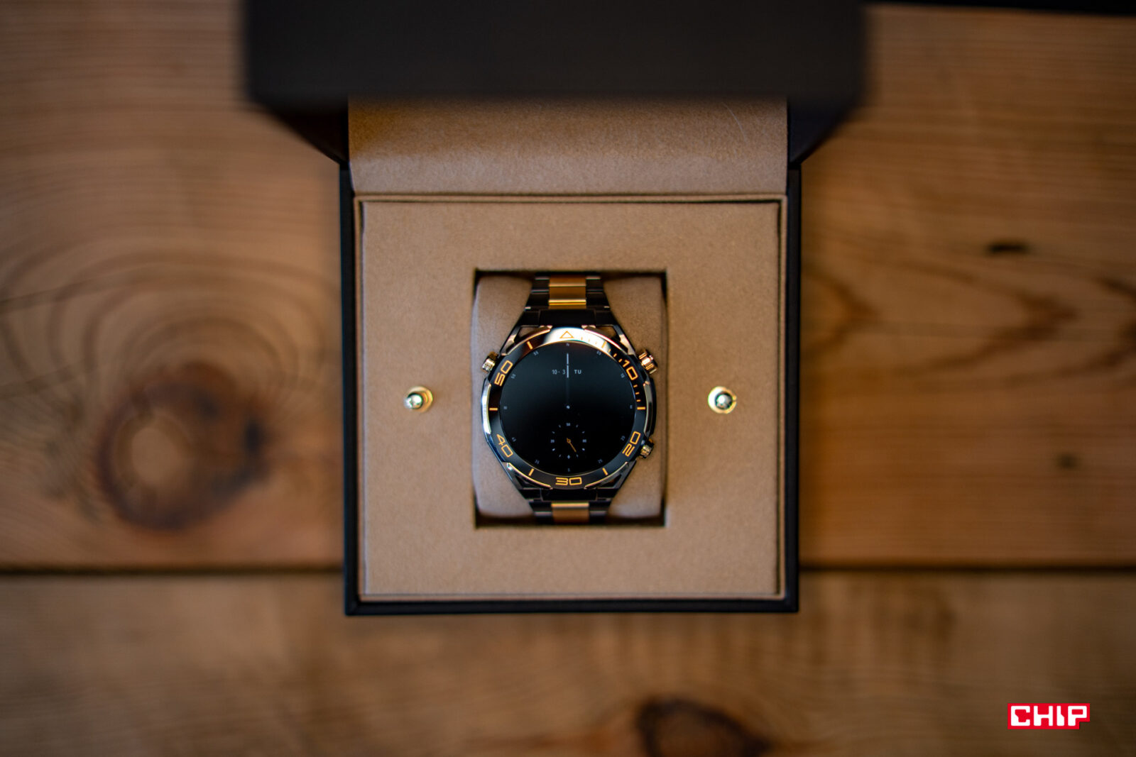 O Watchu Ultimate Design można powiedzieć, że jest złoty, ale technicznie rzecz biorąc ma on tylko złote wstawki. A konkretnie chodzi o złote wstawki na tarczy, których jest sześć, cyfry wokół tarczy, które grawerowane są na pierwszy rzut oka tak samo jak w podstawowym modelu Ultimate. Sprawiają jednak wrażenie jeszcze bardziej matowych w dotyku. Ostatni złoty element to koronka.