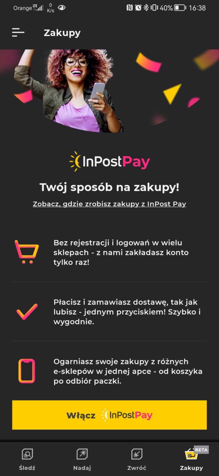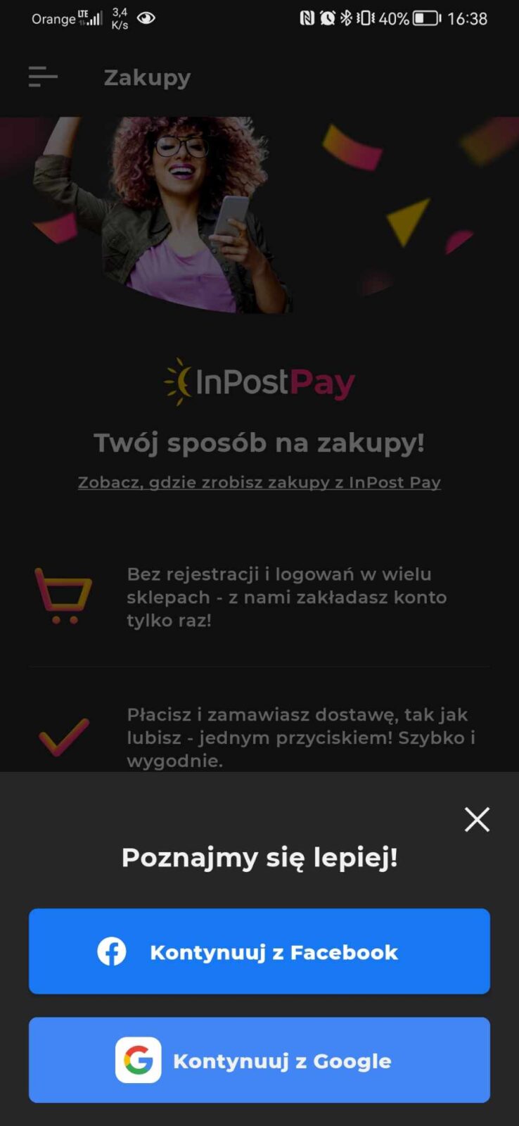 W aplikacji mobilnej dostępnej w Google Play, Apple App Store czy Huawei AppGallery pojawiła się zakładka o nazwie Zakupu. Oznaczona jest jako wersja beta, byśmy nie mieli wątpliwości, że wciąż mamy do czynienia z usługą w fazie testów. Kiedy klikniemy w kartę po raz pierwszy, pojawi nam się plansza wymieniająca zalety InPost Pay – brak konieczności rejestracji i logowania się w wielu sklepach, szybka i wygodna płatność jednym przyciskiem, a także możliwość ogarnięcia zakupów z różnych e-sklepów w jednej apce. Następnie, gdy wybierzemy opcję „Włącz InPost Pay” dostaniemy wybór metody rejestracji. Na razie są tylko dwie opcje – przez Facebooka lub konto Google. To akurat spore ograniczenie, ale z racji, że wciąż mamy do czynienia z wersją beta, nie ma co jeszcze narzekać, firma zapewne rozszerzy to o kolejne sposoby rejestracji.