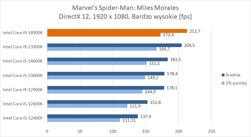 W grach jest podobnie. Średnio nowa konstrukcja wyprzedza poprzednią o 2,8%, czyli nie ma szału. Różnice potrafią być minimalnie większe i np. w Marvel’s Spider-Man: Miles Morales to jest ok. 4%, ale nadal nie ma mowy o rewolucji. Procesor oczywiście będzie jedną z najwydajniejszych jednostek dla graczy, ale ponownie nie tego oczekiwaliśmy po nowej generacji CPU.