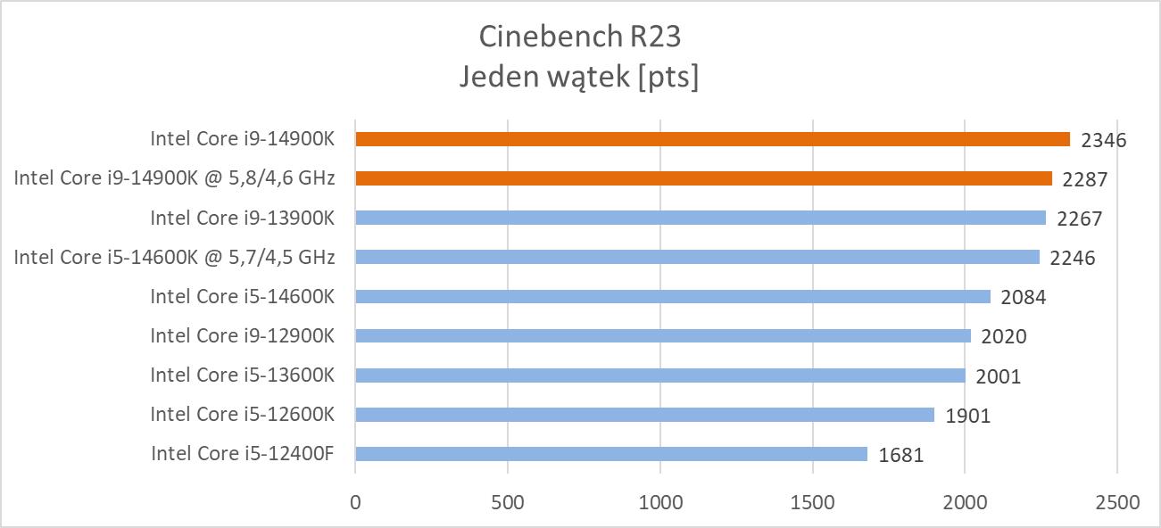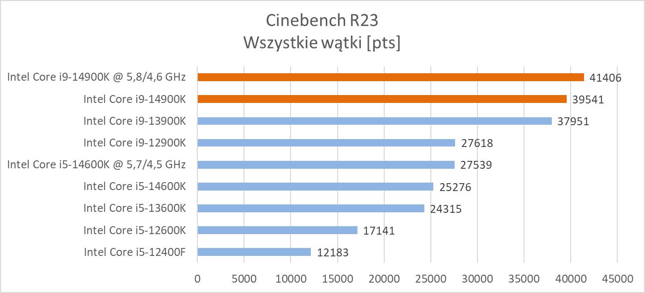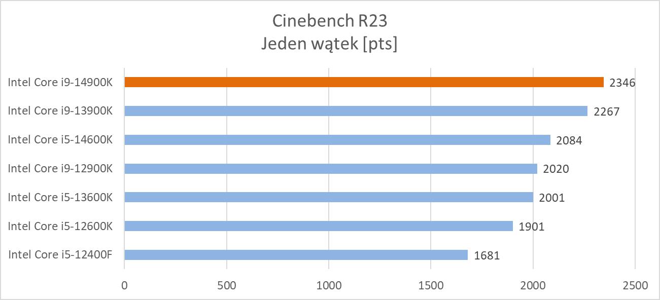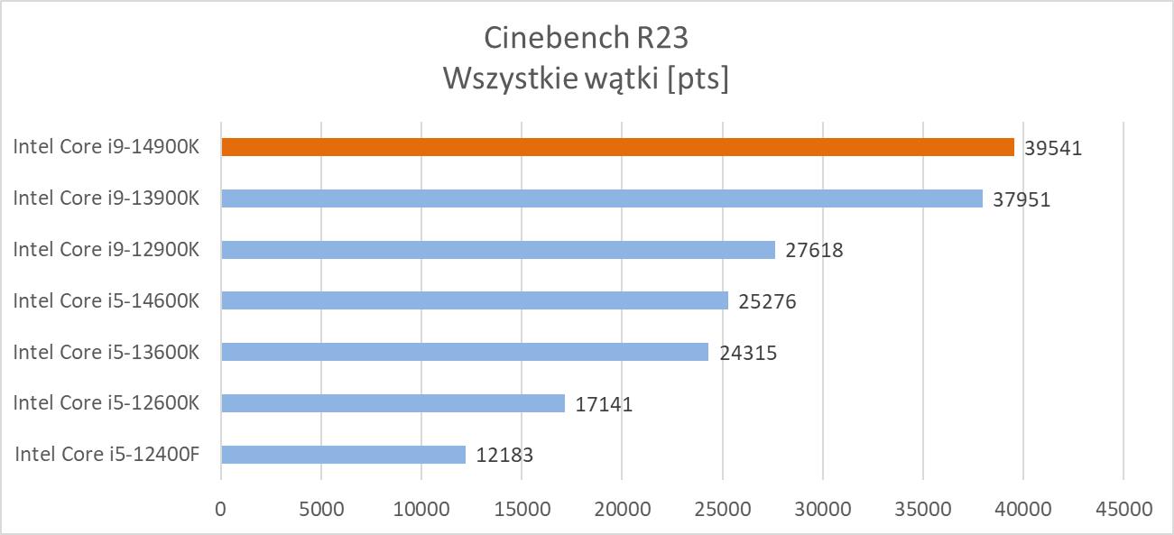 Powyższy wykres jak zawsze stanowi pewne uproszczenia i zbiera wszystkie wyniki z programów. Różnice względem i9-13900K nie są jednak duże i nie ma żadnej mowy o rewolucji. Praktycznie we wszystkich programach nie było jakiś większych odstępów pomiędzy procesorami i tutaj tak naprawdę wpływ na wyniki mają wyższe zegary. Zobaczymy też na samego Cinebencha R23. Tutaj w stosunku do i9-13900K różnica przy jednym wątku wynosi ok. 3,5%, a przy wszystkich ok. 4,2%. Zdecydowanie więc nie ma co liczyć na większe różnice we wszystkich zastosowaniach. Oczywiście w stosunku do i9-12900K są już spore zyski w przypadku nowego procesora, ale to nie jest to, na co wszyscy liczyli.