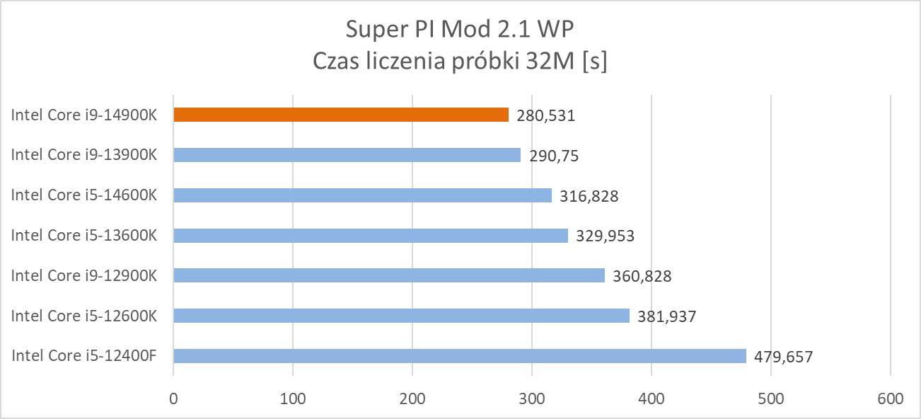 SuperPI liczy liczbę Pi do wskazanej ilości cyfr. Wykorzystuje on do tego algorytm Gauss–Legendre oraz działa tylko na jednym wątku. Jest on bardzo popularny np. podczas zawodów OC. Wykonałem tutaj obliczenia 32 milionów cyfr (32M).