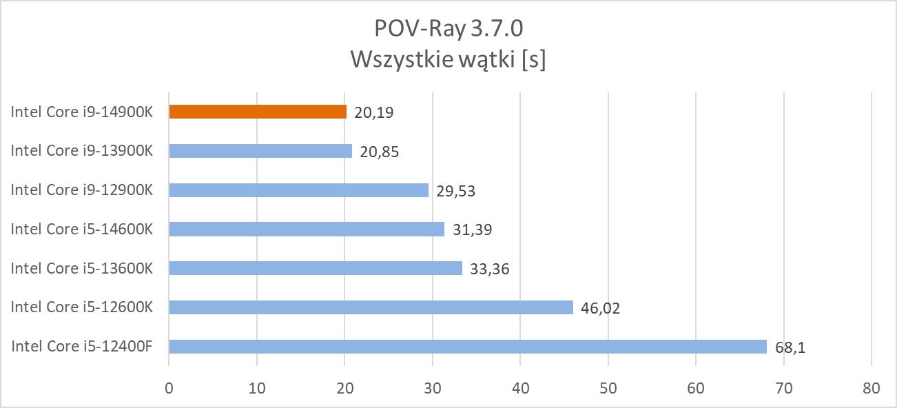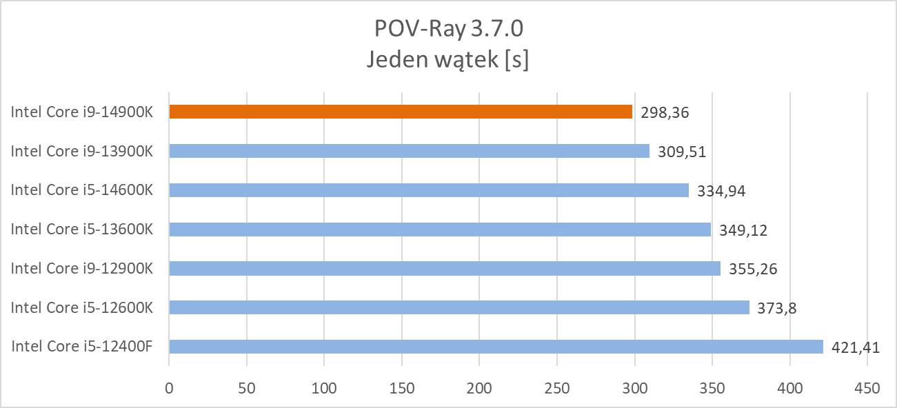 POV-Ray to kolejny program mający wbudowany benchmark. Tym razem pozwala on na tworzenie obrazów z wykorzystaniem ray tracingu i służy głównie do tworzenia grafiki 3D. W testach wykorzystałem benchmark jedno i wielowątkowy.
