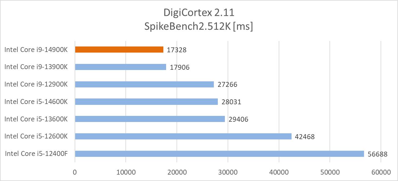 DigiCortex służy do wizualizacji sieci neuronowych oraz symulacji na dużą skalę. Nie zabrakło tutaj wykorzystania dokładnych modeli synaps, ich plastyczności oraz neuronów. Do testów wykorzystałem benchmark SpikeBench2.512K (524288 neuronów, 100M synaps), a wyniki to czas budowania symulacji.