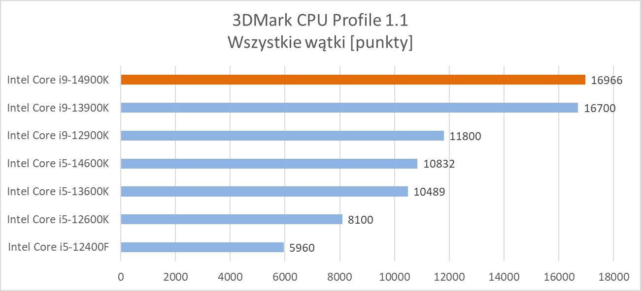 3DMark to jeden z najpopularniejszych benchmarków na świecie. Twórcy wprowadzili do niego CPU Profile, który sprawdza wydajność przy obciążeniu różnej ilości wątków. Zebrałem tutaj wyniki dla jednego oraz maksymalnej ilości wątków.
