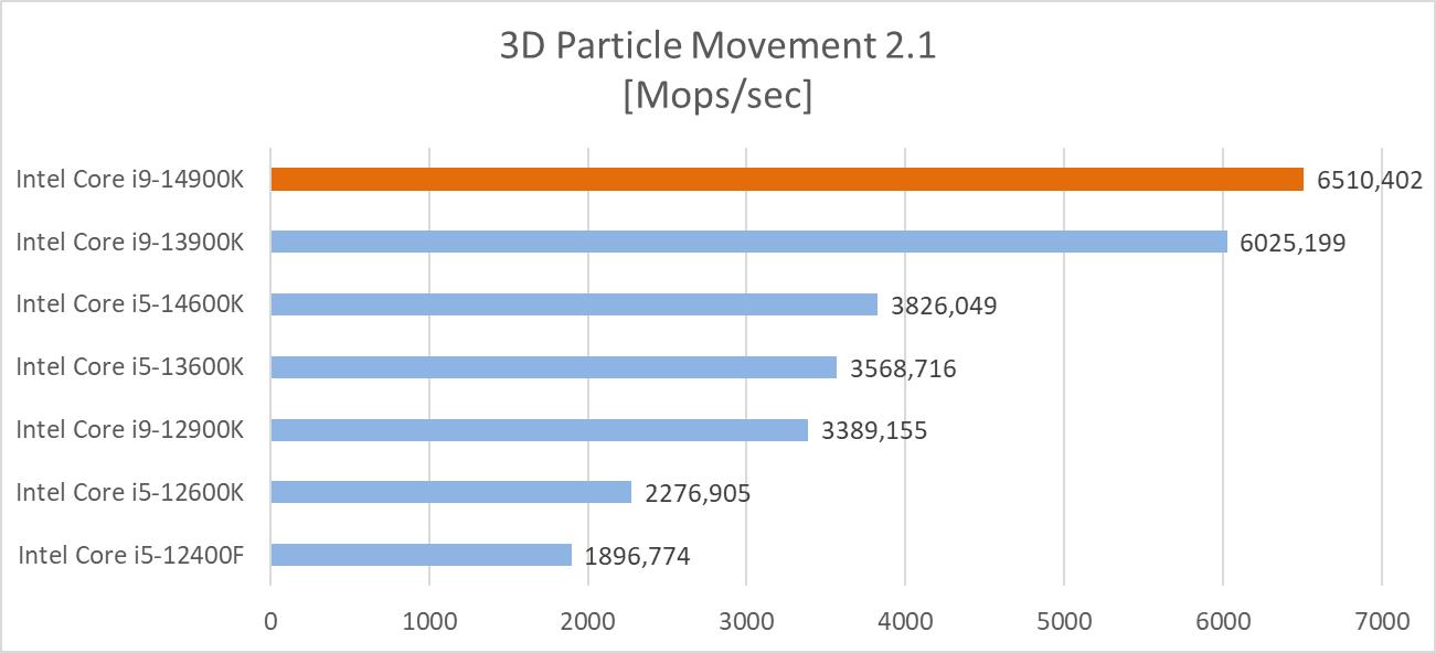 3DPM został opracowany przez serwis Anandtech. Symuluje on sześć różnych rodzajów ruchów cząstek w trójwymiarze. Poniżej znajdziecie ogólny wyniki testu podany jako mops/sec.