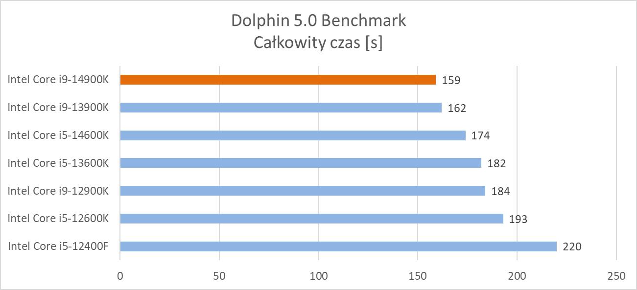 Dolphin pozwala na emulowanie dwóch konsol Nintendo: Wii i GameCube. Dzięki niemu można grać w gry konsolowe w rozdzielczości 1920 x 1080 na komputerze. Wykorzystałem benchmark CPU, a wynik to całkowity czas działania.
