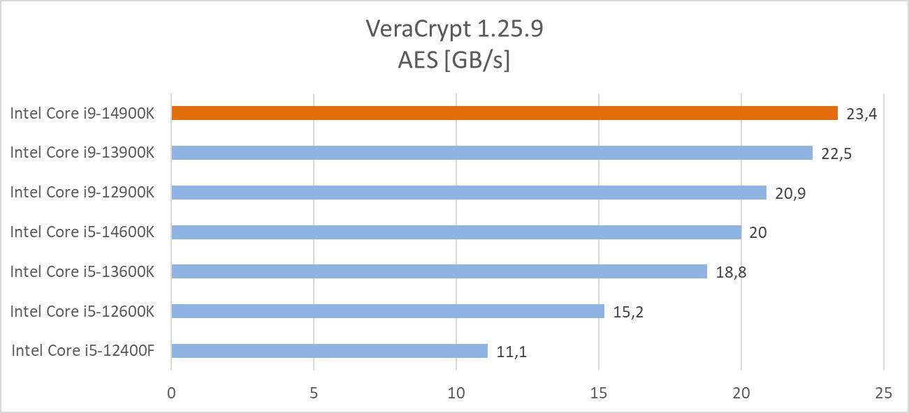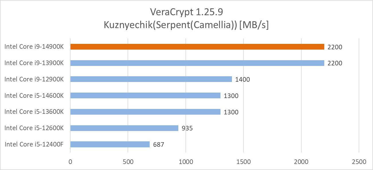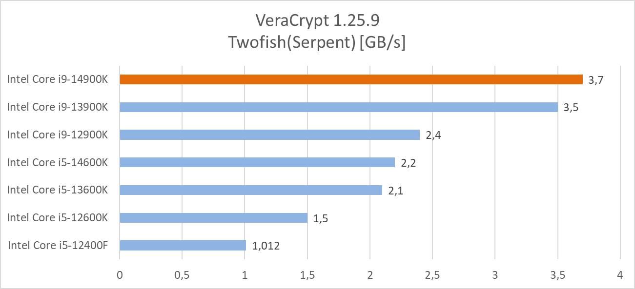 VeraCrypt to oficjalny następca TruCrypt. Jest to oprogramowanie open-source więc nie ma co się dziwić, że jest naprawdę popularny. Program ma wbudowany benchmark, który wykorzystałem w sprawdzeniu wydajności procesorów. Na wykresach poniżej znajdziecie średnie wyniki trzech testów: AES, Twofish(Serpent) oraz Kuznyechik(Serpent(Camellia)).