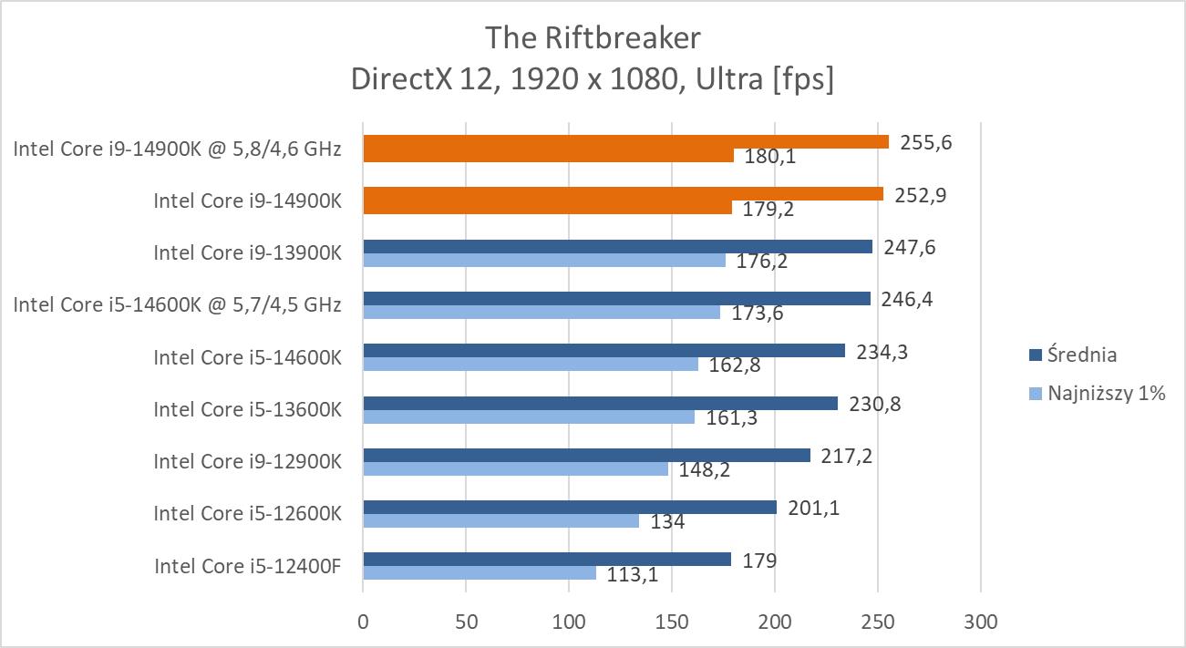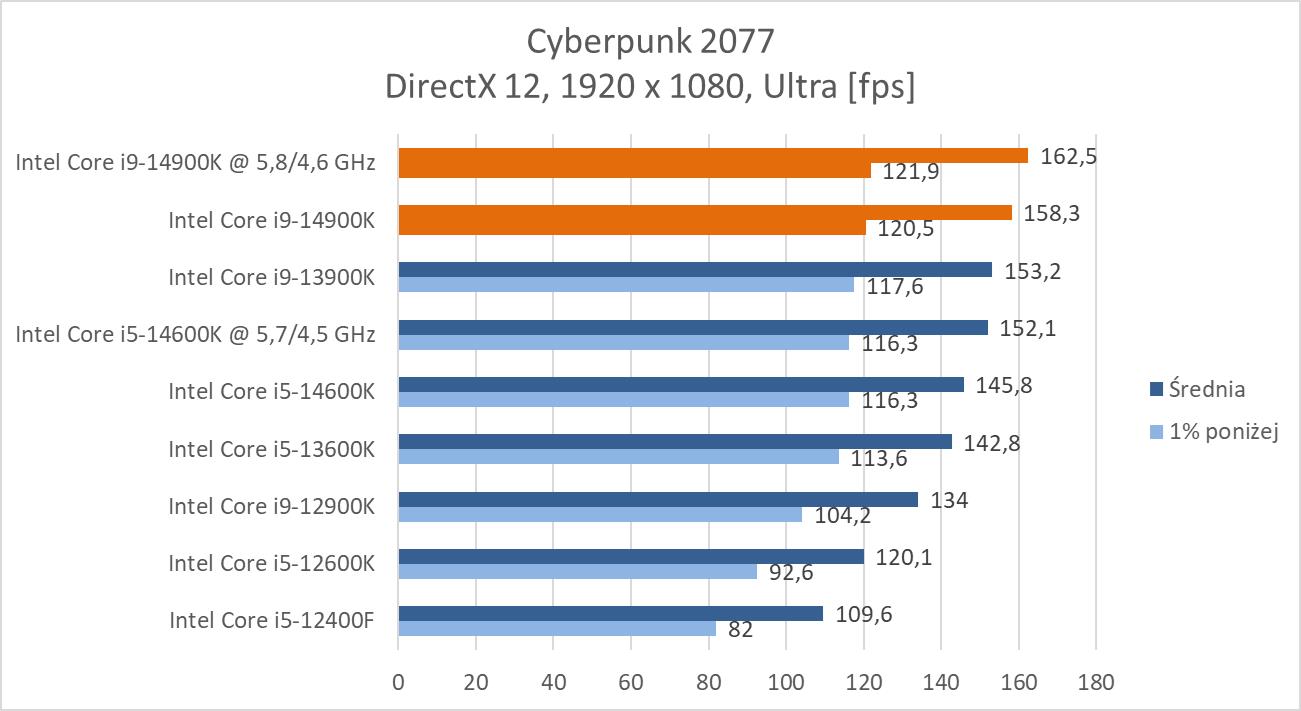 Procesor możecie dosłownie tylko lekko podkręcić. Niestety tutaj jest podobnie jak w przypadku i9-13900K, czyli tak naprawdę nie ma to sensu. Znacznie rosną wtedy temperatury, pobór mocy a wyniki rosną mocniej głównie w programach i to z powodu bardziej zdjęcia limitów mocy. Tutaj ewentualnie polecam tego dokonać, a podnoszenie napięcia w celu zyskania tych 100 MHz na rdzeniach P po prostu mija się z celem.