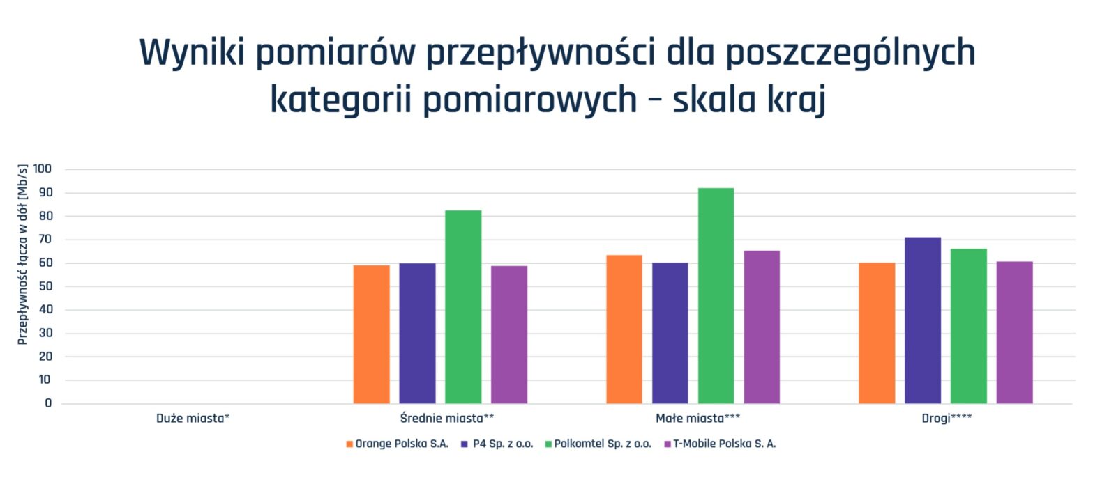 Tutaj mamy też dane obejmujące miasta, które potwierdzają obecną przewagę Plusa nad konkurencją. Dlaczego nie ma tu dużych miast (50-100 tys. mieszkańców), nie wiadomo, natomiast średnie obejmują zakres 30-50 tys. mieszkańców, a małe 10-30 tys. mieszkańców. Na drogach Plus nie ma już przewagi, co wynika zapewne z tego, że operator rozbudowuje sieć 5G głównie w miejscowościach, ale warto podkreślić, że wyniki względem konkurencji są porównywalne. Z mojego doświadczenia wynika, że jeszcze 2-3 lata temu sieć Plusa była naprawdę koszmarna na drogach, więc warto tę poprawę docenić.