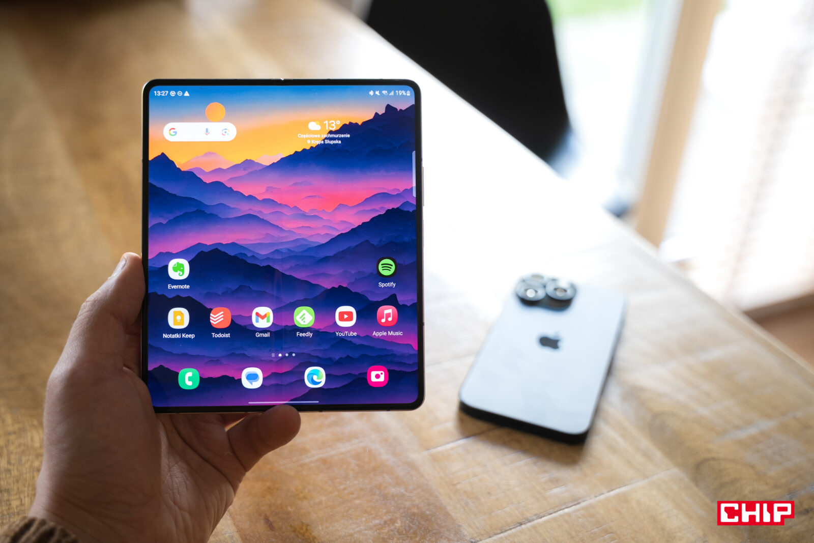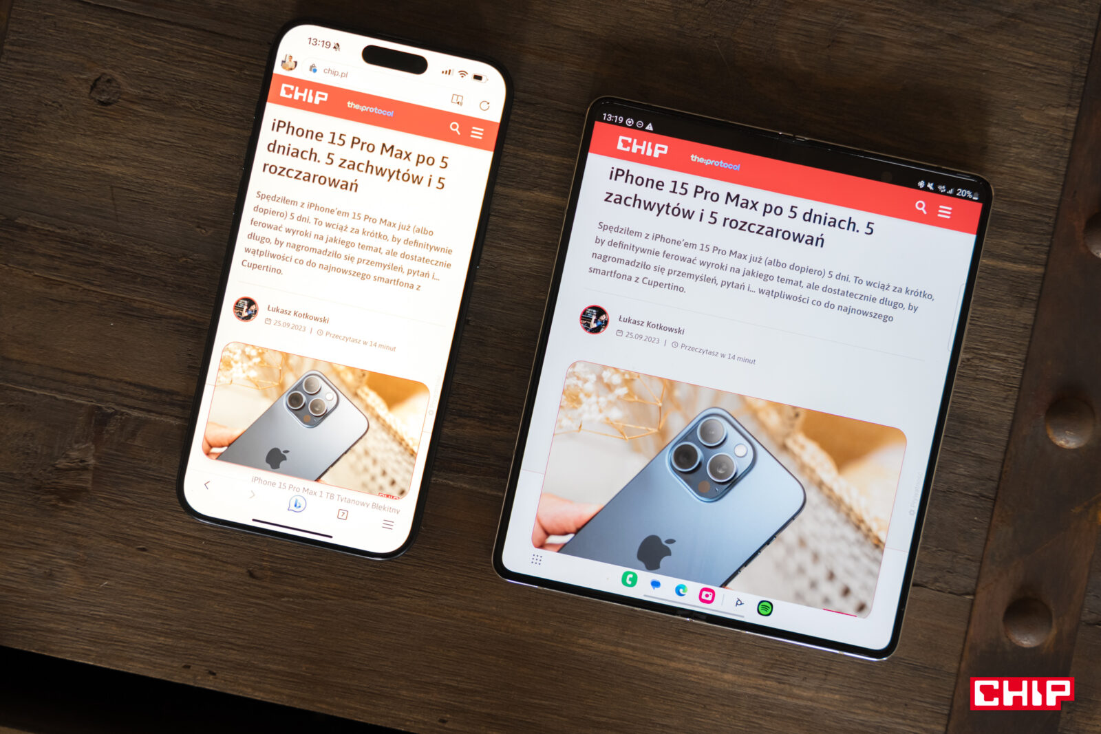 Dziś skupimy się na tym, jak iPhone 15 Pro Max spisuje się długodystansowo, a jednocześnie porównamy go z innym smartfonem, który w topowej wersji kosztuje około 10 tys. zł – składanym Samsungiem Galaxy Z Fold 5. Również jego recenzję możecie przeczytać na łamach Chip.pl: