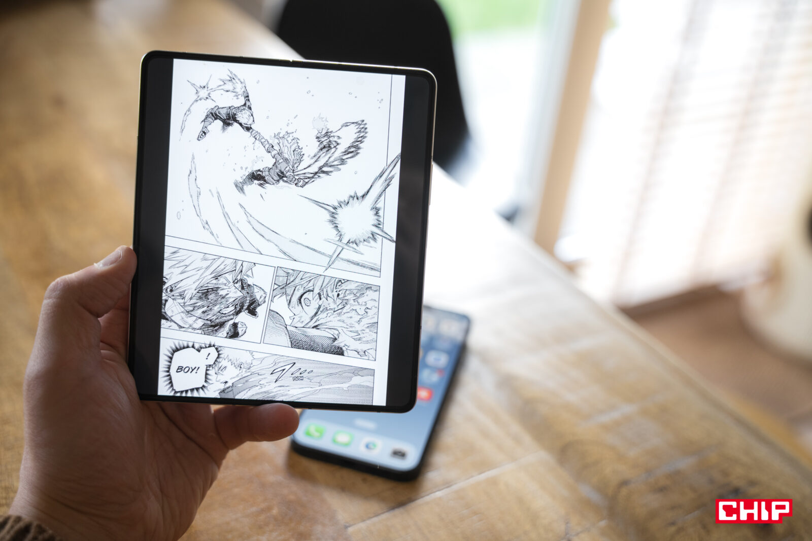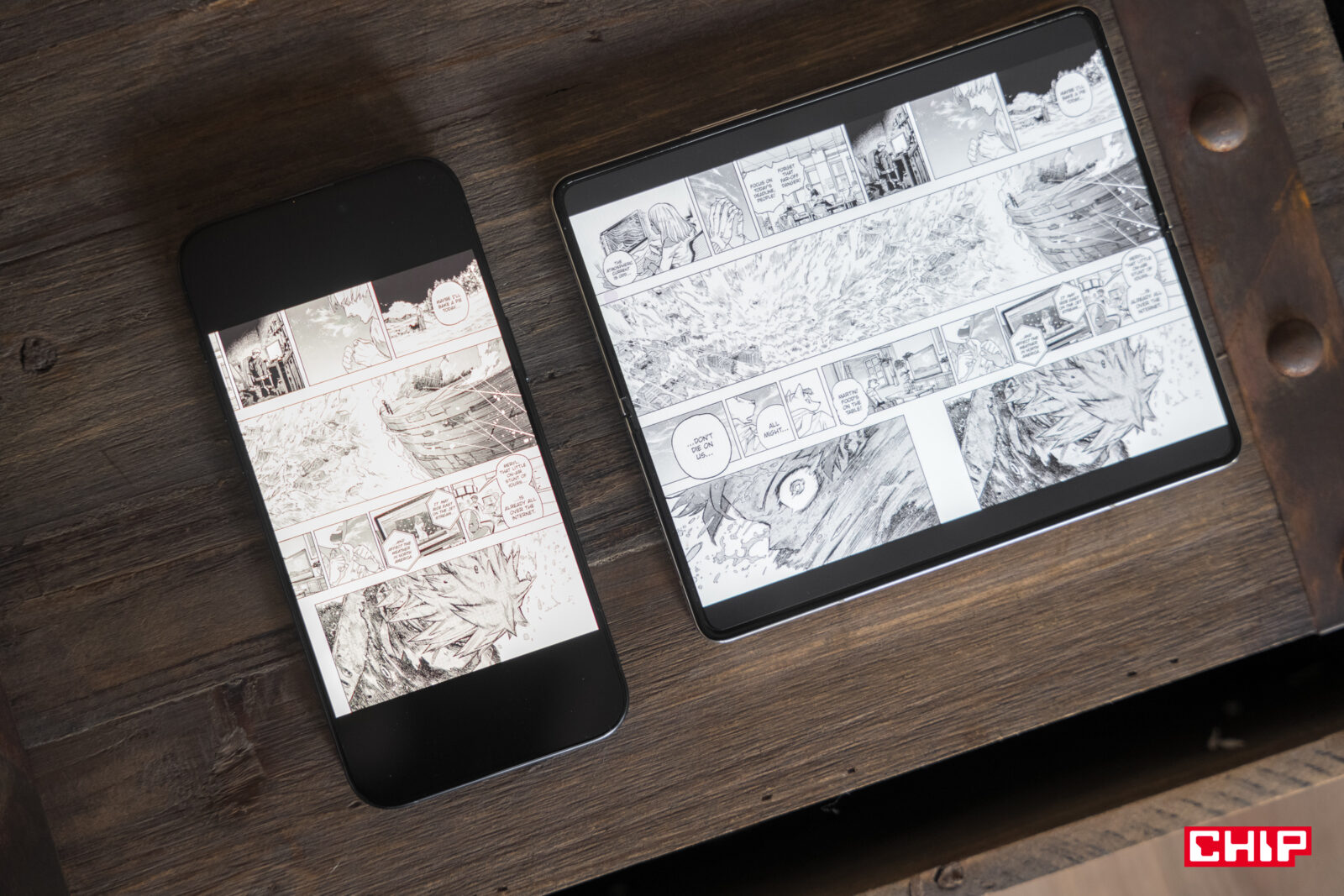 Wychwalałem wyżej konsumpcję multimediów na iPhonie i nie odwołuję tych słów, ale to kolejny aspekt, w którym Samsung wypada po prostu lepiej. Wewnętrzny ekran rozkładanego telefonu jest większy, przez co wszystko widać wyraźniej, a też mieści się na nim więcej treści. Osobiście najbardziej doceniam to czytając mangi albo robiąc poranną prasówkę, bo trzymając w ręku Z Folda 5 mam wrażenie, jakbym czytał książkę lub czytnik e-booków, a trzymając iPhone’a zawsze czuję się tak, jakbym bezmyślnie scrollował social media. Nadmienię też, że choć głośniki Z Folda 5 nie są aż tak dobre, jak topowego iPhone’a, to przegrywają z nim o włos.