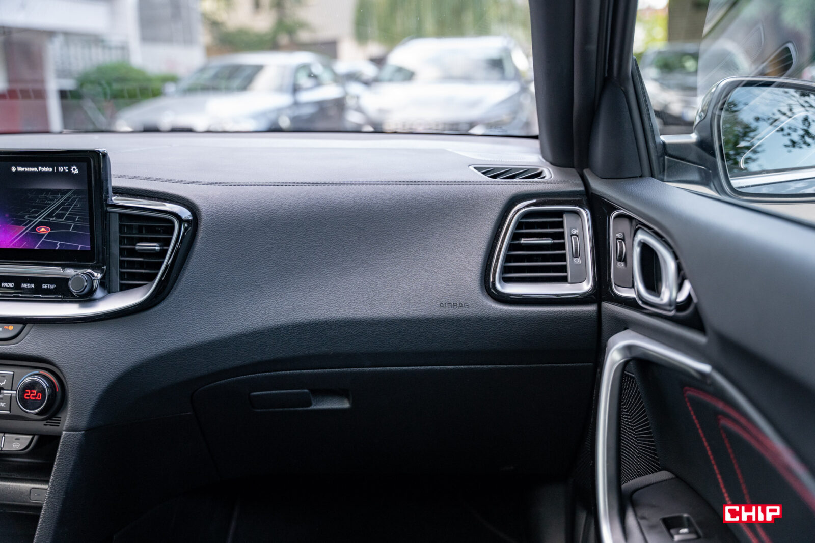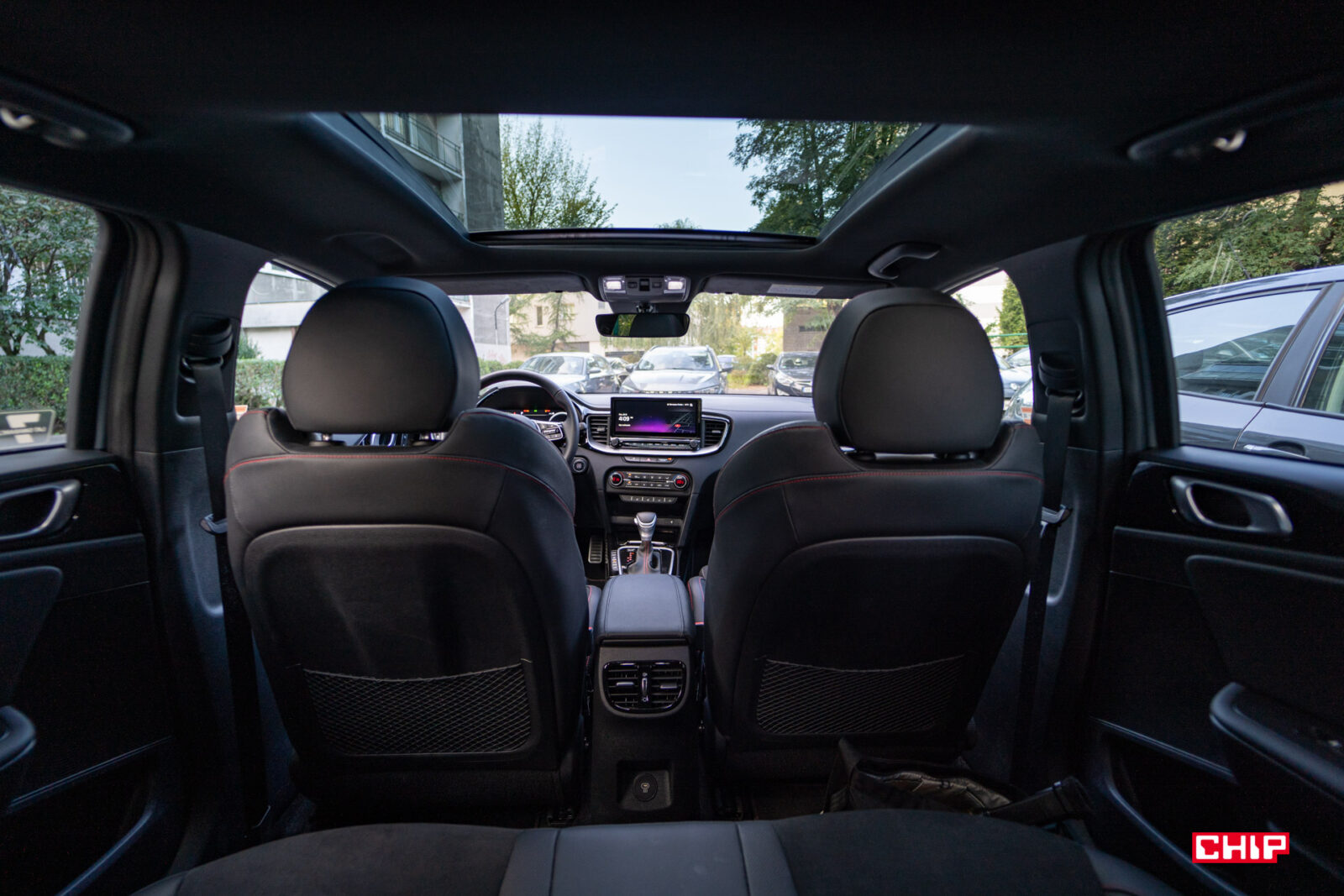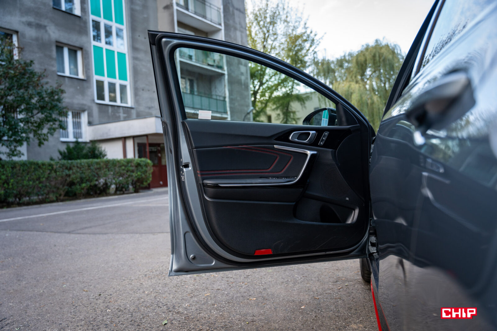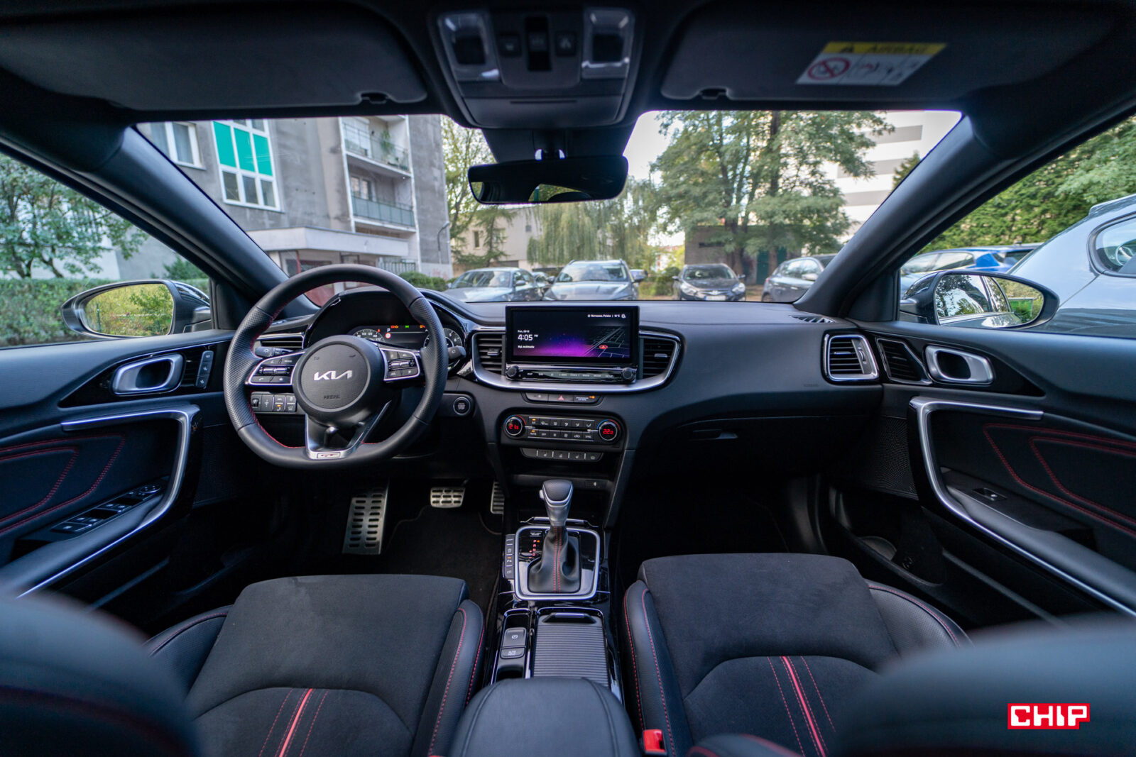 ProCeed w wersji GT jest wyposażony w sportowe fotele. Nie skrajnie sportowe, więc spokojnie, nie są straszne w długich trasach. A wręcz przeciwne, są szalenie wygodne i dobrze trzymają na zakrętach. Niestety nie mogę Wam ich pokazać z tej samej perspektywy co zawsze, bo dosłownie we wszystkich zdjęciach foteli od przodu ostrość poszła… w las. Chyba się wstydziły zapozować. A niepotrzebnie, bo są skórzano-zamszowe i mają efektowne, czerwone przeszycia. Dedykowane dla wariantu GT.
