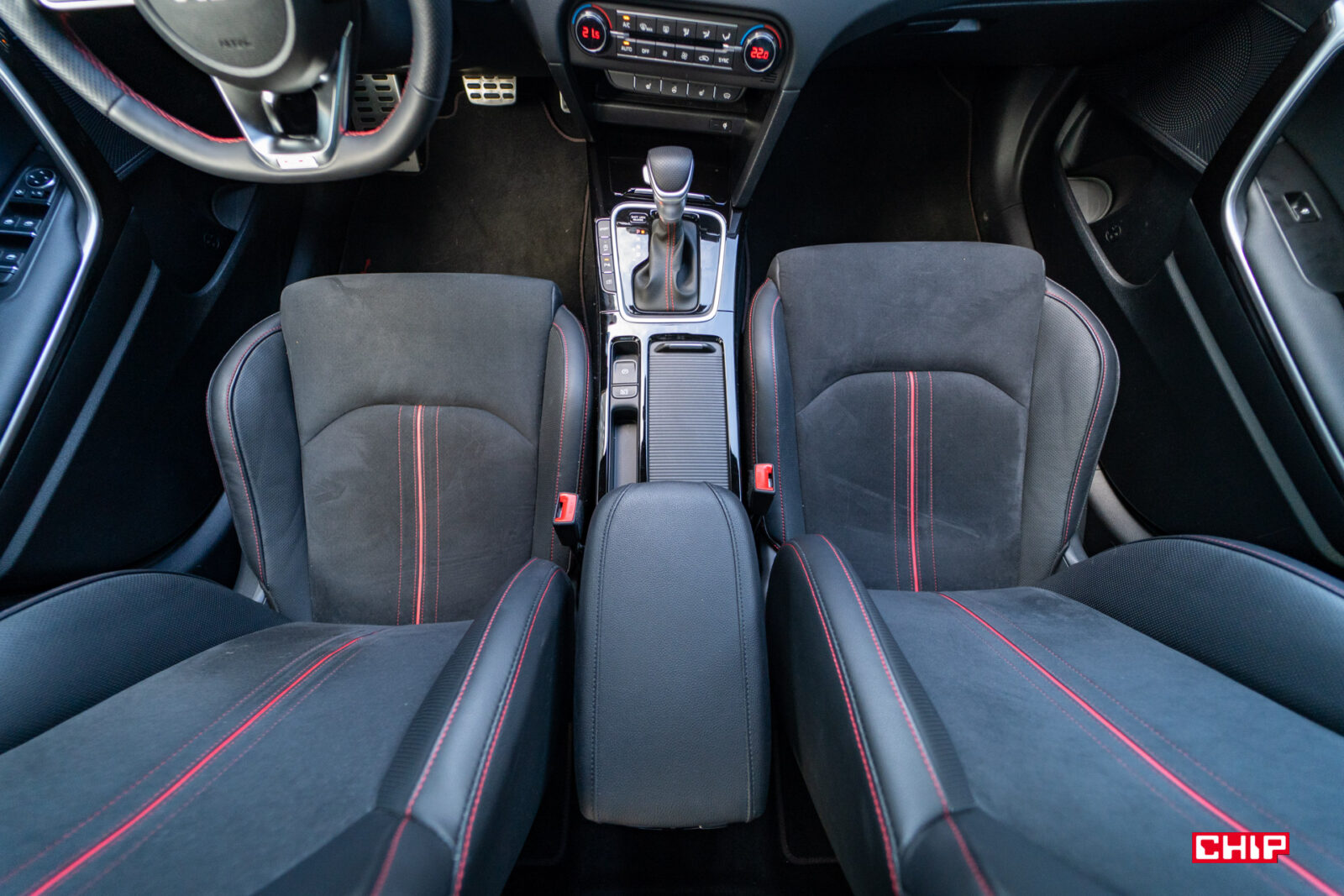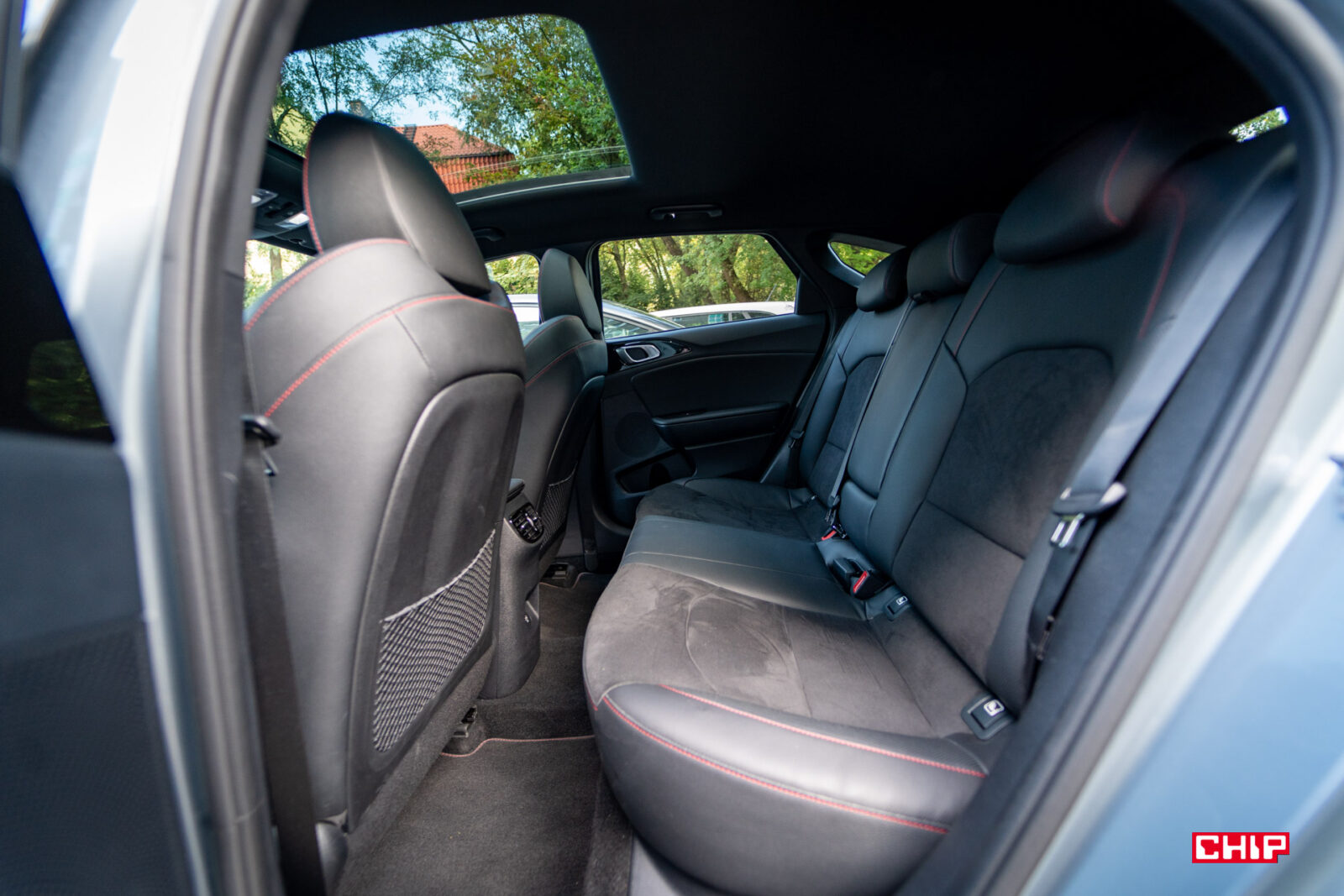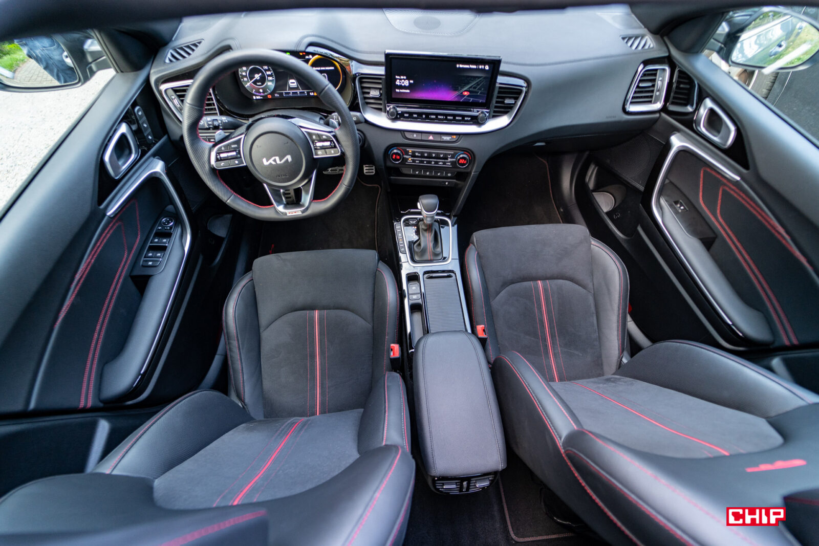 ProCeed w wersji GT jest wyposażony w sportowe fotele. Nie skrajnie sportowe, więc spokojnie, nie są straszne w długich trasach. A wręcz przeciwne, są szalenie wygodne i dobrze trzymają na zakrętach. Niestety nie mogę Wam ich pokazać z tej samej perspektywy co zawsze, bo dosłownie we wszystkich zdjęciach foteli od przodu ostrość poszła… w las. Chyba się wstydziły zapozować. A niepotrzebnie, bo są skórzano-zamszowe i mają efektowne, czerwone przeszycia. Dedykowane dla wariantu GT.