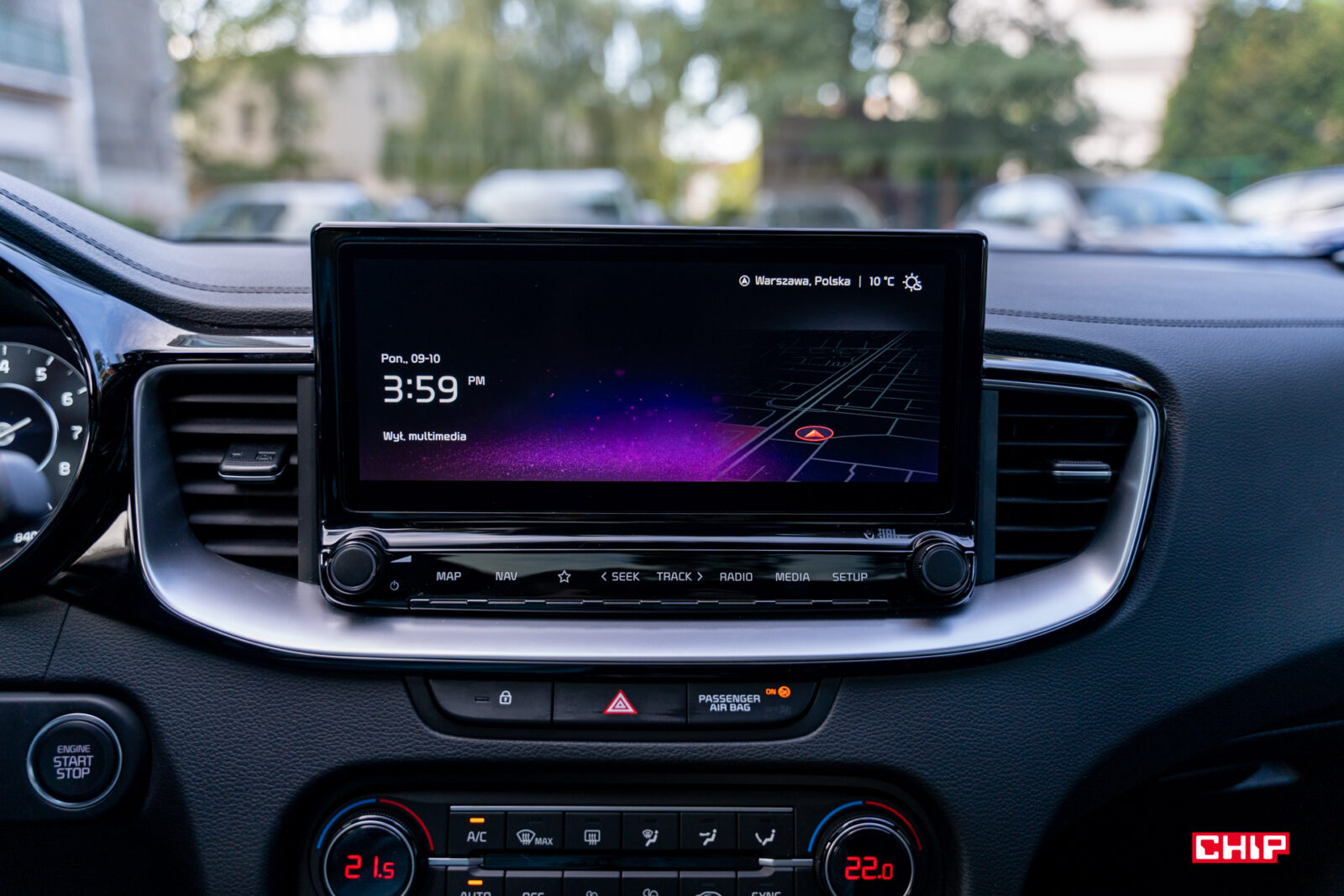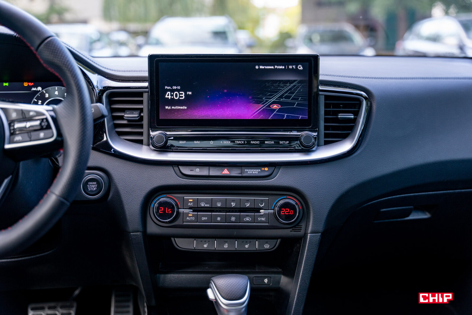 Kia ProCeed GT ma w zasadzie te same multimedia co wszystkie współczesne modele producenta. Interfejs jest przejrzysty, czytelny i bardzo prosty w obsłudze. Pod ekranem głównym mamy kilka dotykowych przycisków, ale na dobrą sprawę można się na co dzień obyć bez nich. Pochwalić trzeba zaktualizowane oprogramowanie, dzięki czemu Android Auto jest wyświetlany na całej szerokości ekranu, a nie jak w starszych modelach tylko na 2/3.