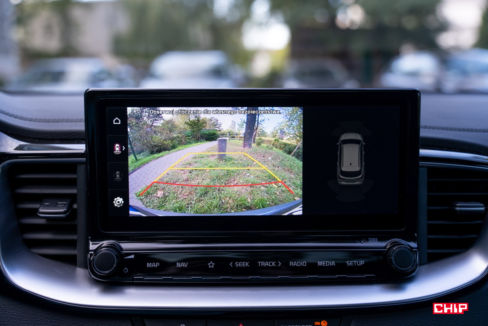 Kia ProCeed GT nie ma w cenniku opcji dodania kamer 360 stopni. Więc nie ma też, znanego z innych modeli producenta, podglądu z kamer na lusterkach podczas włączenia kierunkowskazów. Szkoda, ale na pocieszenie pozostaje bardzo dobra kamera cofania z dynamicznymi liniami pomocniczymi.