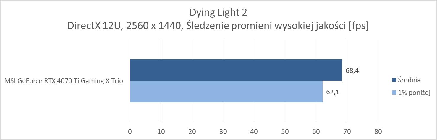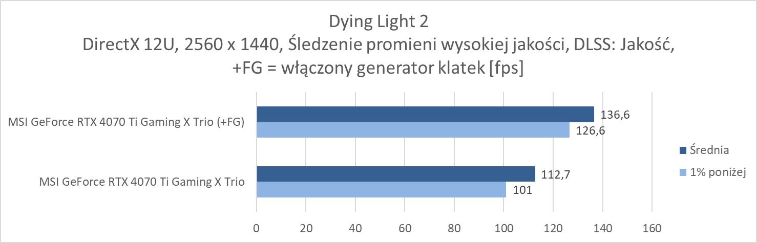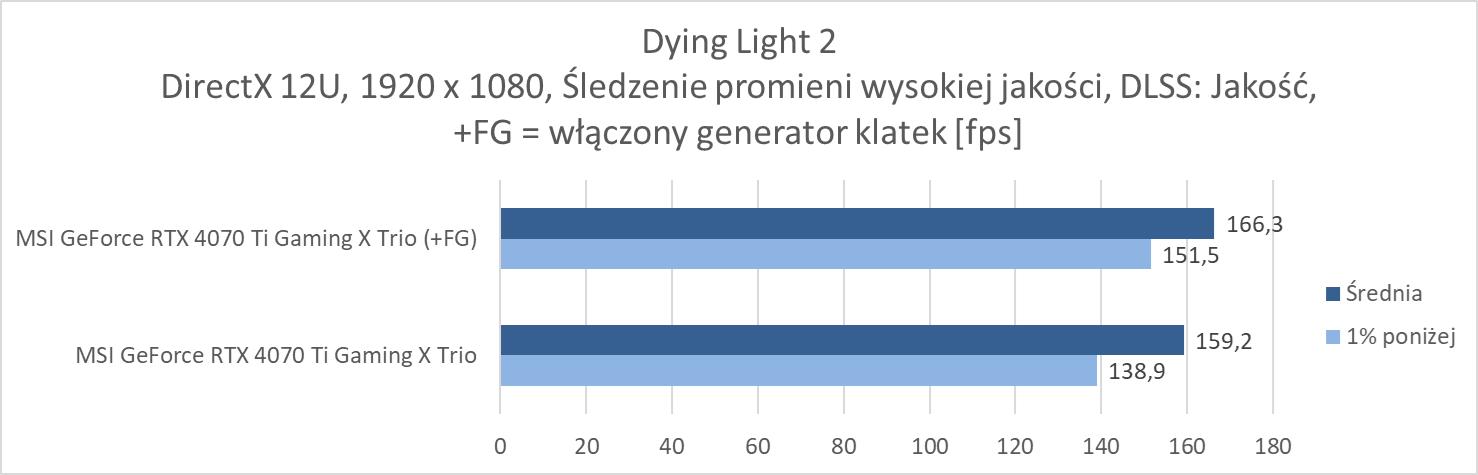 W kolejnej rozdzielczości nawet z samym DLSS: Jakość mamy obie gry w pełni płynne. Ponownie też widać, jak sporo dodaje FG, w tym przypadku większy zysk jest już również w Dying Light 2.