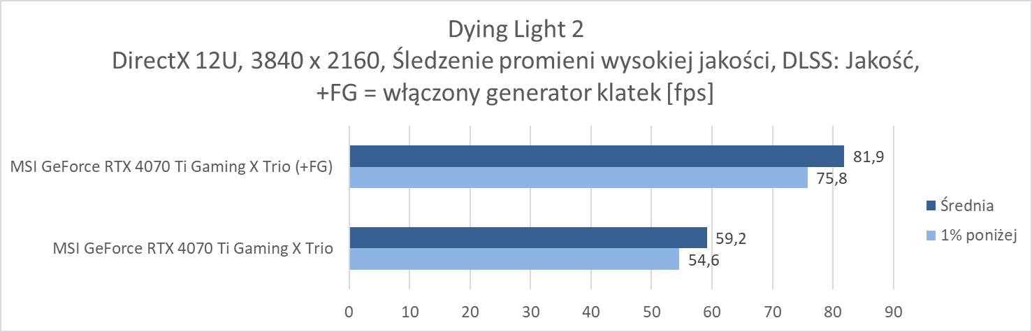 Z DLSS: Jakość wyniki są bardzo wysokie. Widać też dobrze, jak mocno generator klatek w Cyberpunku podbija wyniki. W Dying Light 2 zysk z FG jest za to minimalny.