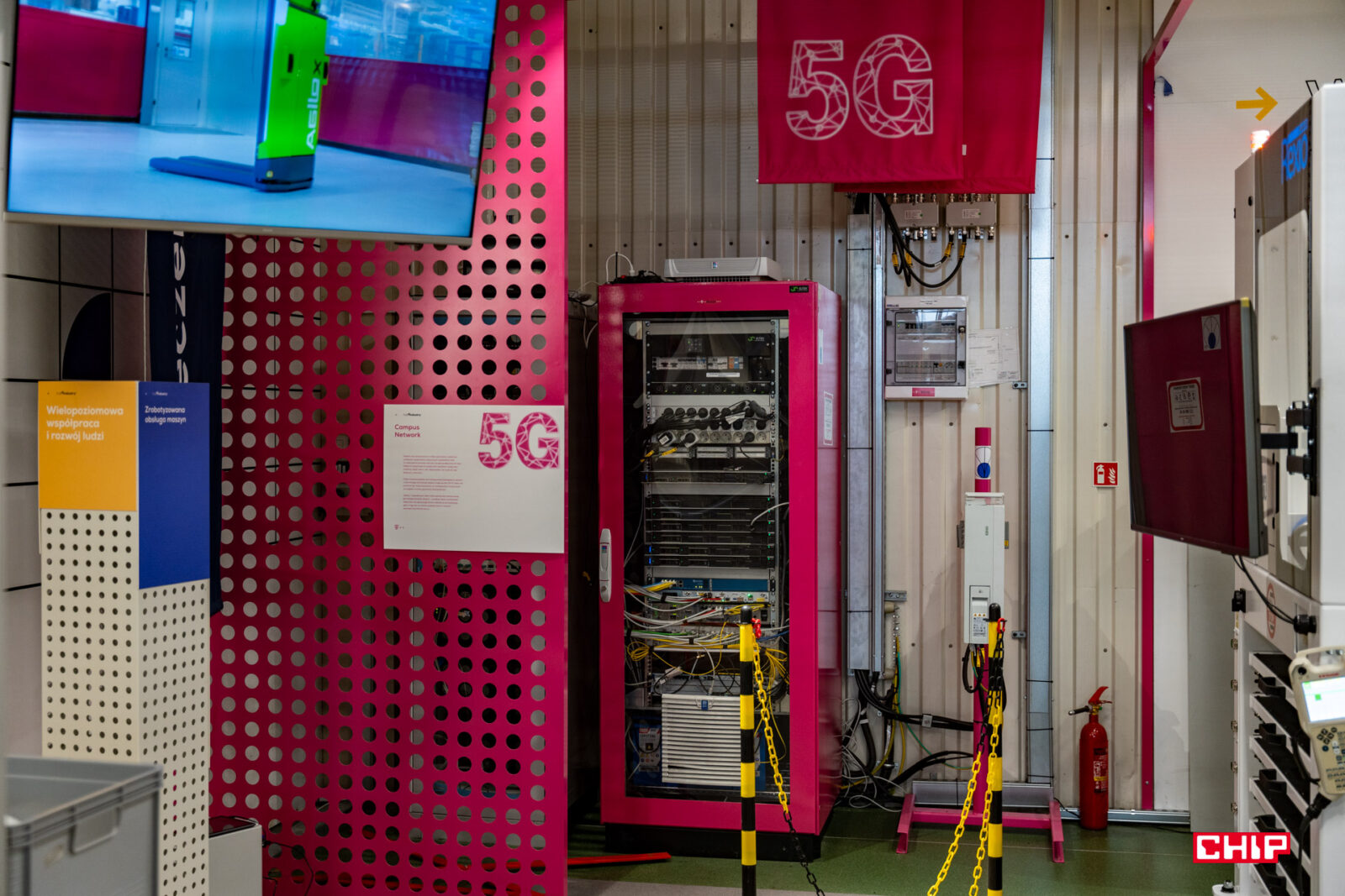 Autonomiczne wózki widłowe wykorzystujące zaawansowane czujniki Lidar? Obecne! Tylko… akurat w dniu wizyty nie były obecne fizycznie, mogłem zobaczyć ich działanie na materiale wideo. Wszystkie urządzenia dostępne w showroomie firmy są obsługiwane za pomocą prywatnej sieci 5G dostarczonej przez T-Mobile. Mają tam nawet własną stację bazową.