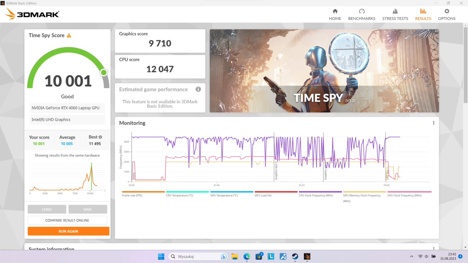 Mój egzemplarz Lenovo LOQ 15 wyposażony był w procesor Intel Core 13. generacji i7-13620H, 16GB RAM-u DDR5 5200 MHz, SSD o pojemności 1 TB oraz kartę graficzną Nvidia GeForce RTX 4060 z 8 GB vRAM. W syntetycznych benchmarkach ta kombinacja osiąga naprawdę przyzwoite wyniki, a dostępny jest też wariant z nieco mocniejszym procesorem Intel Core i7-13700H.