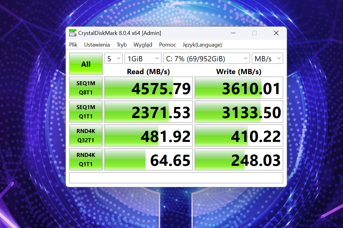 Co bardzo cieszy, nie musimy się decydować na najdroższą konfigurację przy zakupie, bo producent pozwala bez problemu dołożyć jedną kość RAM-u (max 32 GB) i zostawia nam wolny dodatkowy slot M.2 PCIe gen. 4. Skoro zaś o SSD mowa, to wykręca on całkiem przyzwoite prędkości. Nie jest to poziom topowych laptopów dla graczy, ale nie wyobrażam sobie, by komukolwiek szybkości zabrakło: