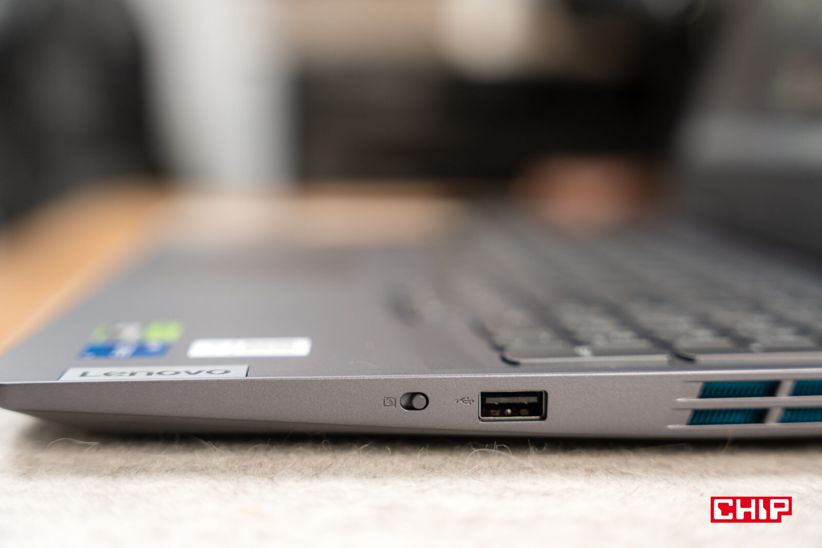 Po prawej stronie znajduje się kolejne złącze USB-A 3.2 gen 1 (5 Gbps) oraz fizyczny przełącznik osłony kamery internetowej, zaś po lewej stronie gniazdo słuchawkowe oraz USB-C 3.2 gen 2, z obsługą Display Port oraz zasilaniem do 140W. Umieszczenie tego jednego gniazda jest dla mnie nieco niezrozumiałe, bo moim zdaniem powinno się ono znaleźć z tyłu, obok gniazda zasilania i złącza HDMI, skoro ma ono służyć przede wszystkim do podłączenia do stacji dokującej lub monitora USB-C.