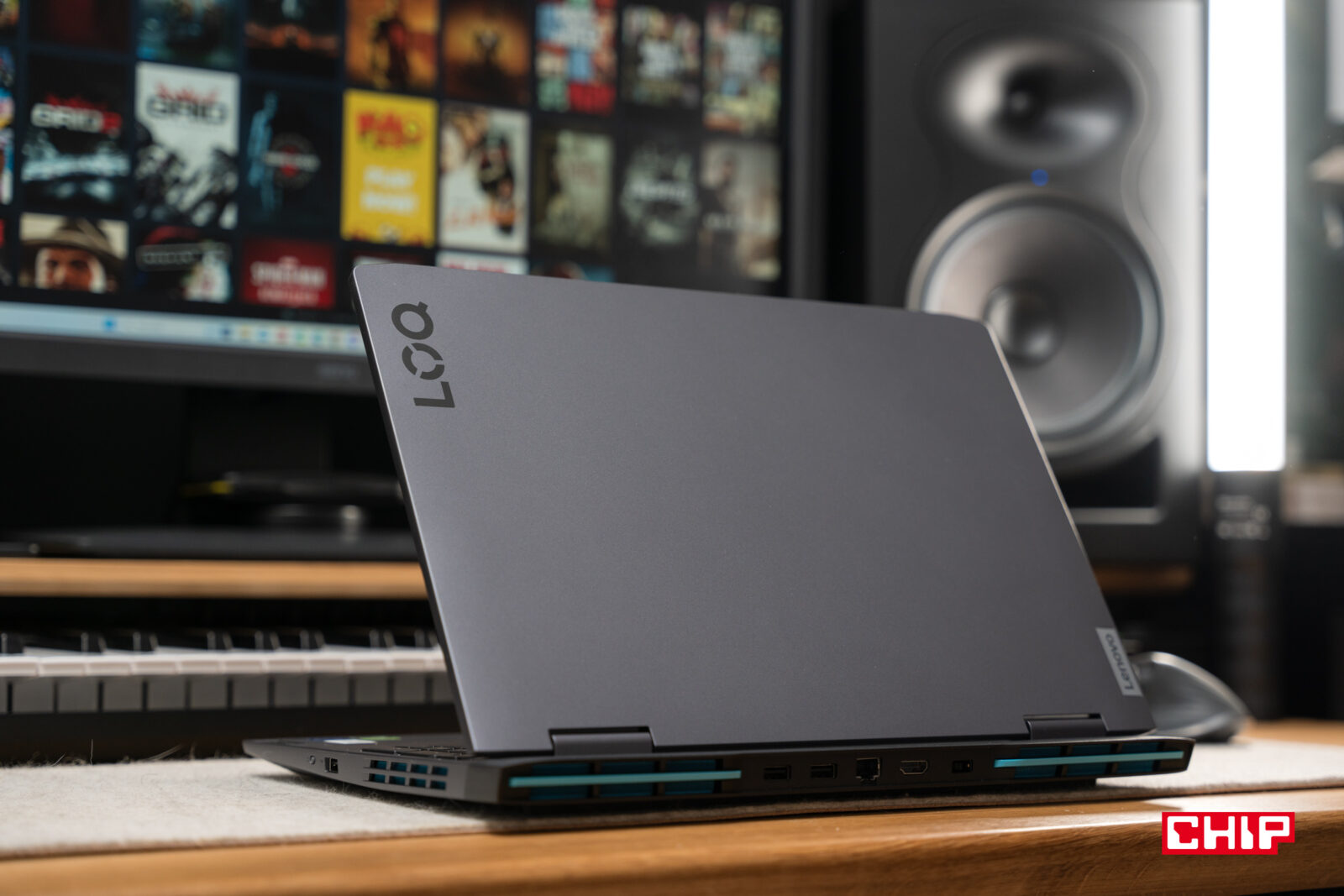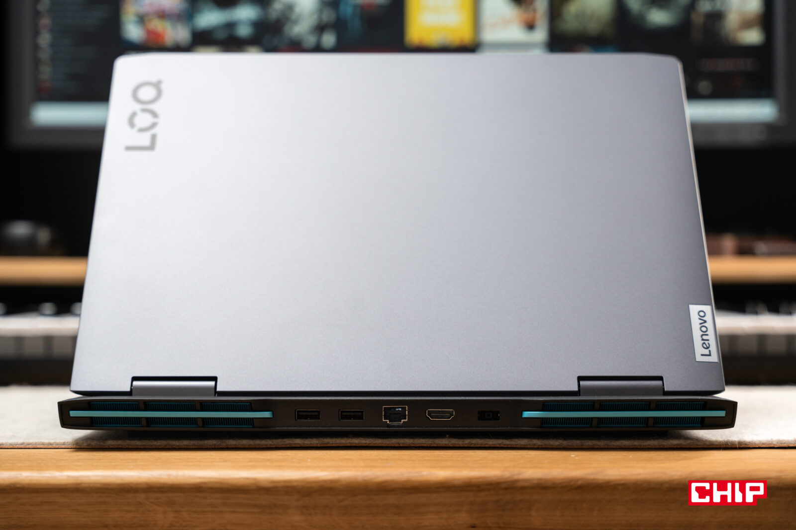 LOQ 15zachował charakterystyczny projekt serii Legion, z wylotami powietrza umieszczonymi za zawiasem ekranu i większością złącz umieszczonych z tyłu. Mamy tam gniazdo zasilające, HDMI 2.1 oraz dwa porty USB-A 3.2 gen. 2.