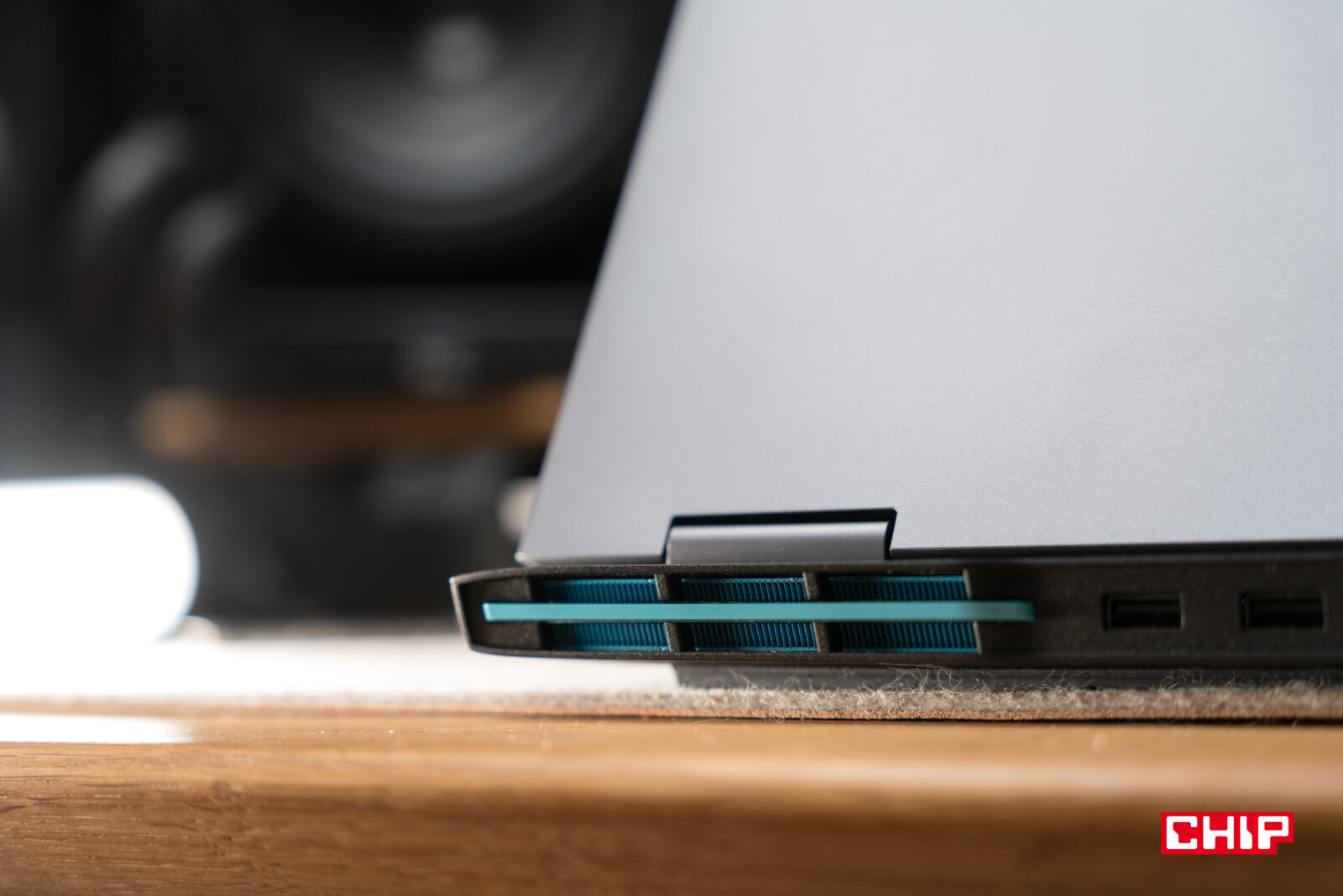 Producent chwali się zaawansowanym systemem chłodzenia, obejmującym dwa wentylatory 85 mm, cztery rurki cieplne i większe wloty oraz wyloty powietrza niż w poprzedniej wersji. Czy chłodzenie jest skuteczne? Jak najbardziej. Ani razu nie zdarzyło się, by laptop zagrzał się na tyle, by odczuwalnie wpłynąć na rozgrywkę czy pracę. Niestety pod obciążeniem LOQ 15 wydaje odgłosy jak odrzutowiec i cierpi na typowy syndrom laptopa dla graczy – atak szumem wiatraków bez wyraźnego powodu. Do tego gdy laptop jest podłączony do prądu, wentylatory pracują non stop i to całkiem wyraźnie, nawet gdy są na najniższych obrotach. Prawdopodobnie można to zachowanie opanować stosując customowe krzywe, ale fabrycznie LOQ 15 zachowuje się tak, jak każdy inny laptop dla graczy – hałasuje w sposób absolutnie nieprzewidywalny.