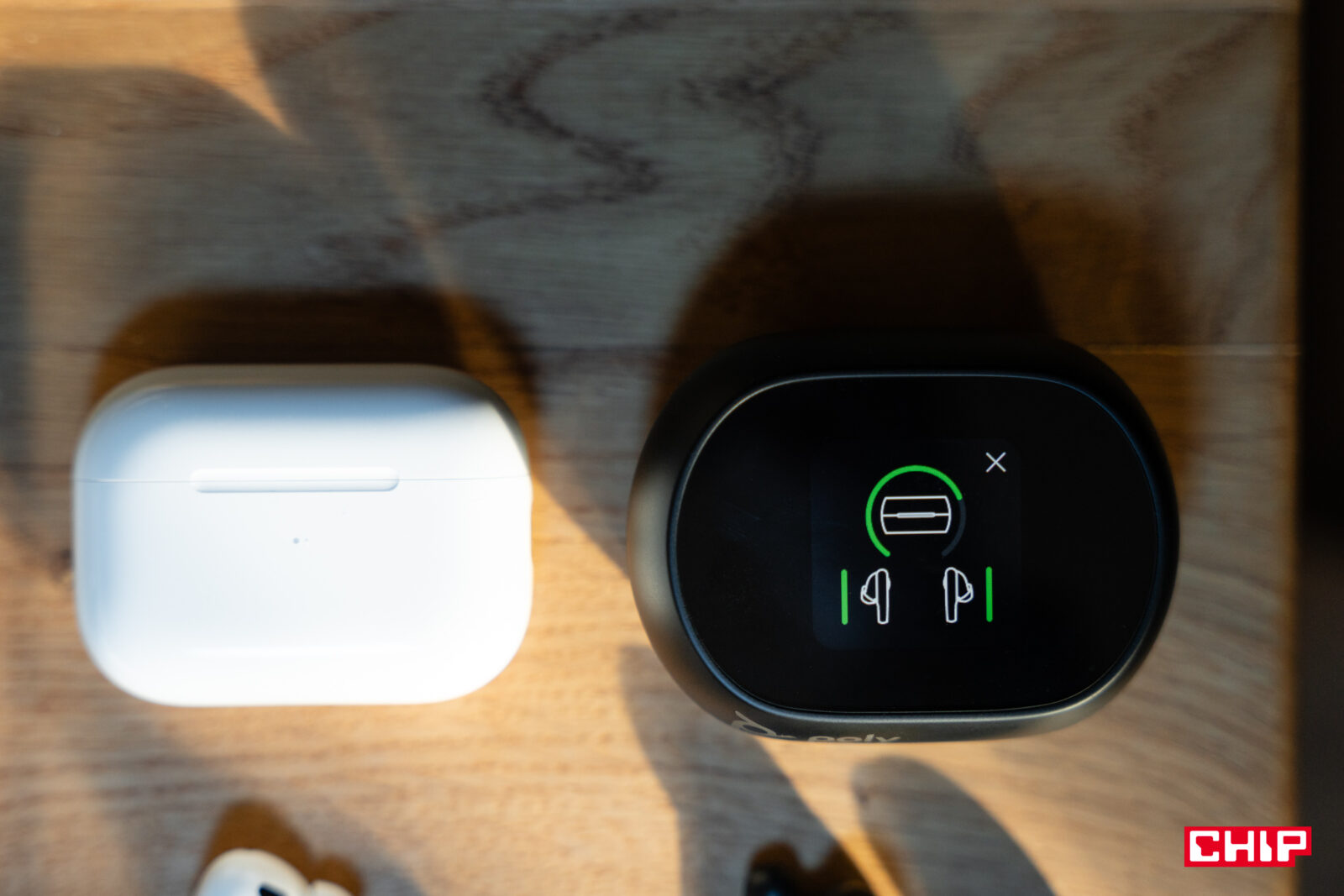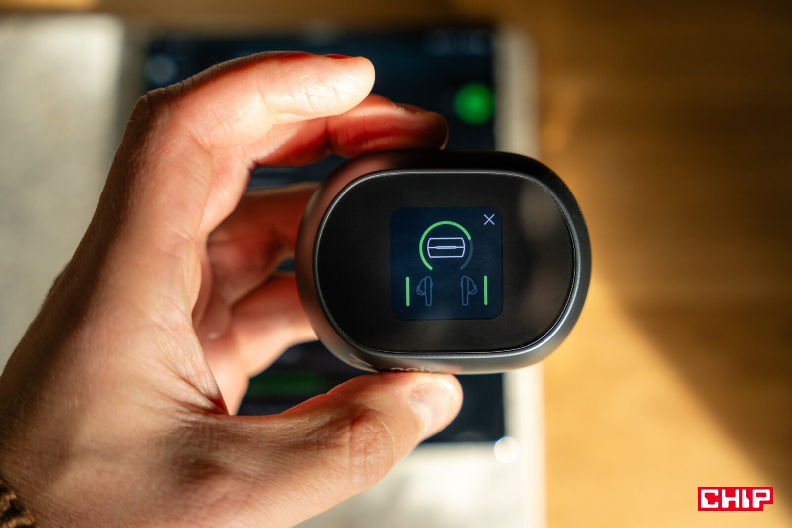 Nie na się nie zauważyć, że u szczytu etui znajduje się niewielki, kolorowy wyświetlacz. Możemy podejrzeć na nim poziom naładowania słuchawek, sterować odtwarzaniem i podstawowymi ustawieniami, takimi jak połączenie z urządzeniem czy ANC.