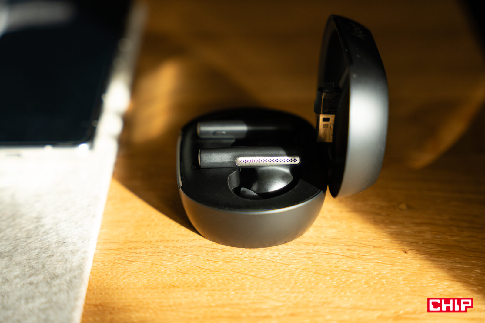 Etui pozwala też ładować słuchawki na ładowarkach Qi, a skoro o tym mowa, to warto od razu powiedzieć, że same słuchawki wytrzymują do 5,5h ciągłego użytku i do 24h łącznego użytkowania po doładowaniu w etui. W etui znajdziemy też adapter USB-A, pozwalający podłączyć słuchawki do komputera i przełączać się między telefonem a komputerem nie musząc polegać na (bądźmy szczerzy) zawodnej technologii multipoint.