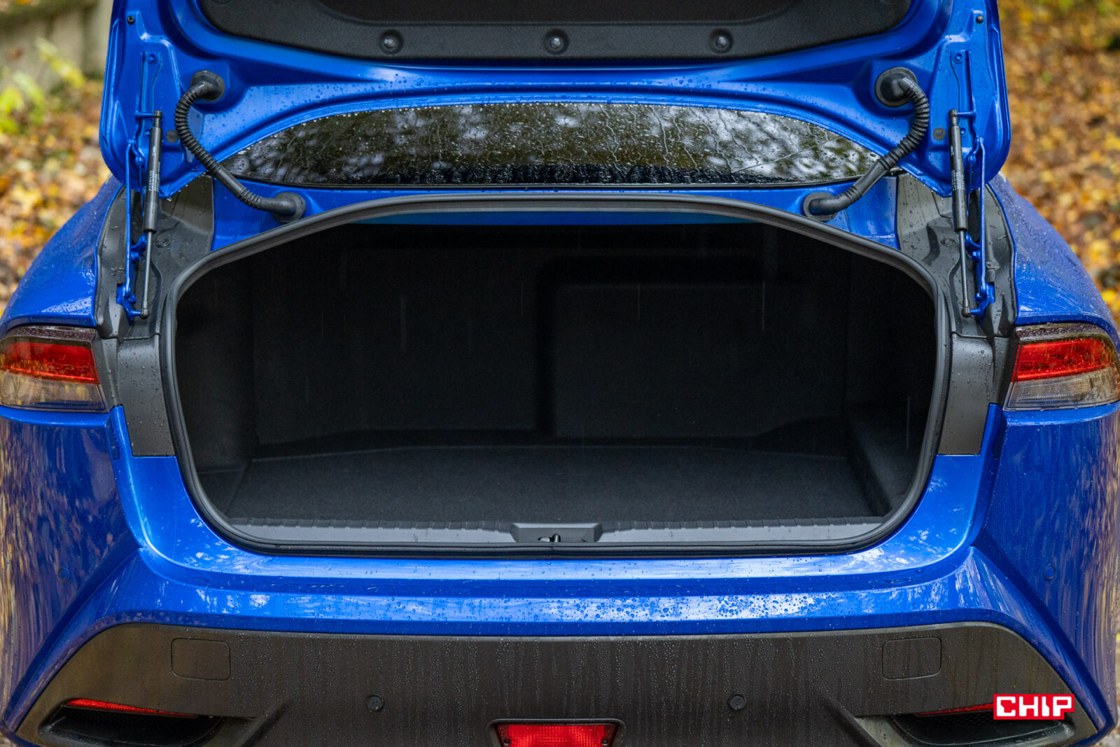 Wnętrze jest bardzo dobrze wyciszone i nawet przy prędkościach autostradowych mogliśmy normalnie rozmawiać w trakcie jazdy, a jedyne co przebijało się do wnętrza to deszcz uderzający o szybę. Komfort mamy tu dosłownie pod każdym względem, również akustycznym. Cisza dotyczy też pracy silnika i powtórzmy – jak w elektryku. Choć można się zdziwić tym, że auto na zielonych tablicach… dymi. I to co więcej, dymi jakby poszła mu uszczelka pod głowicą, bo na biało. Szczególnie że warunki ku temu sprzyjały, bo było chłodno i bardzo wilgotno, więc para wodna, którą Mirai czasem sobie strzeli jest dużo bardziej widoczna. Tak, auto co jakiś czas puszcza takiego bączka od spodu i nie, nie ma tu klasycznego wydechu. Od spodu mamy małą rurkę, z której wydobywa się para. Czasem da się usłyszeć w środku delikatnie syknięcie.