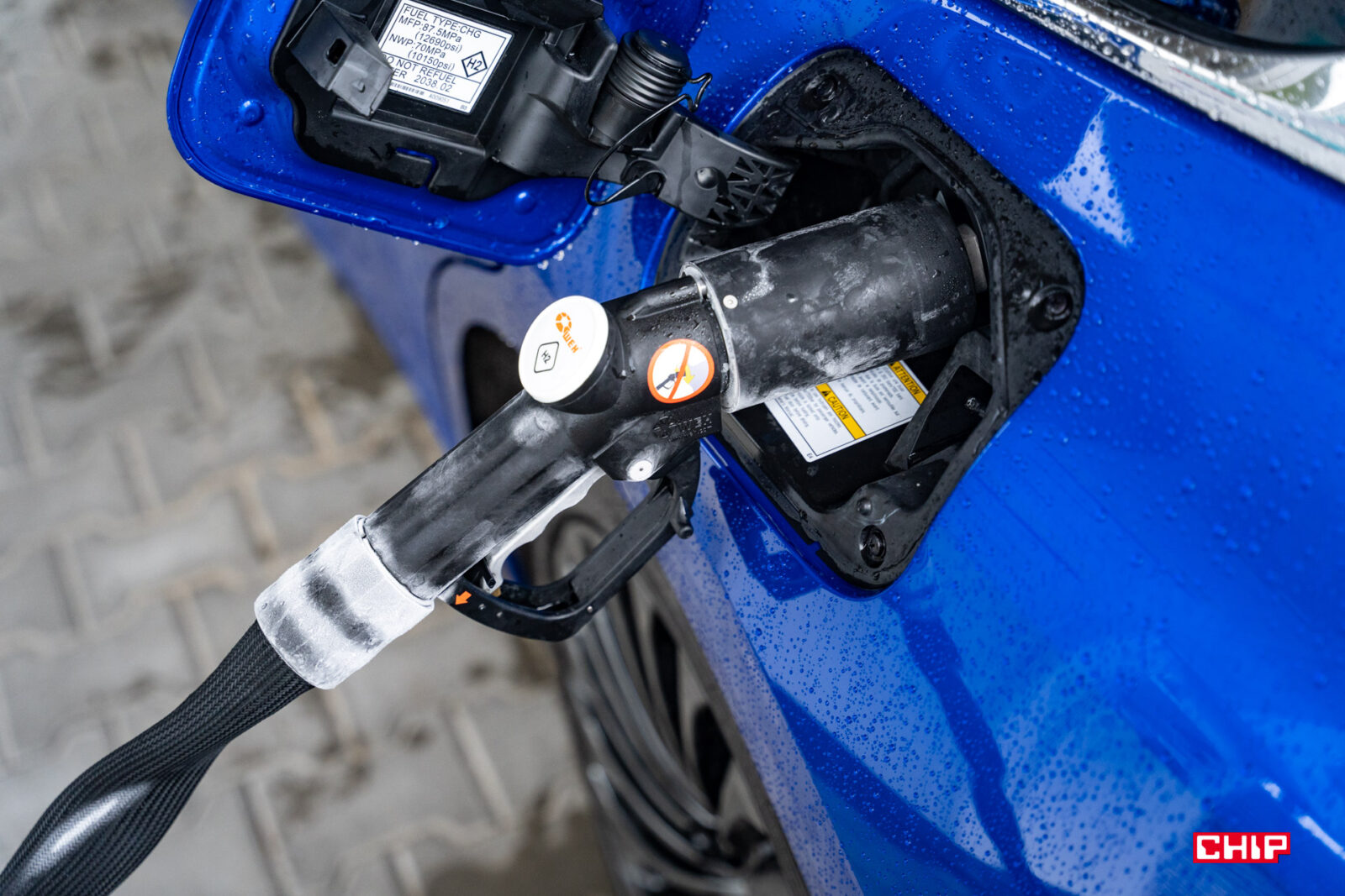 Tankowanie Toyoty Mirai trwa ok 5 minut. W tym czasie widzimy, jak na przewodzie oraz pistolecie pojawia się szron. Staje się on chłodny w dotyku, ale spokojnie, nie przymarzniecie do niego. Co jakiś czas tankowanie się zatrzymuje, co jest związane z koniecznością wyrównania ciśnienia w zbiornikach. Po skończonym procesie odpinamy kabel i można ruszać w dalszą drogę. Stacja potrzebuje ok 3 minut na przygotowanie się do tankowania kolejnego auta. Nawet niech cały proces między autami trwa 10 minut to jest to porównywalne z zatankowaniem auta benzyną i odstaniem chwilę w kolejce.