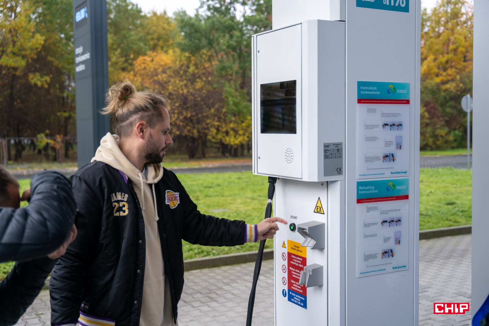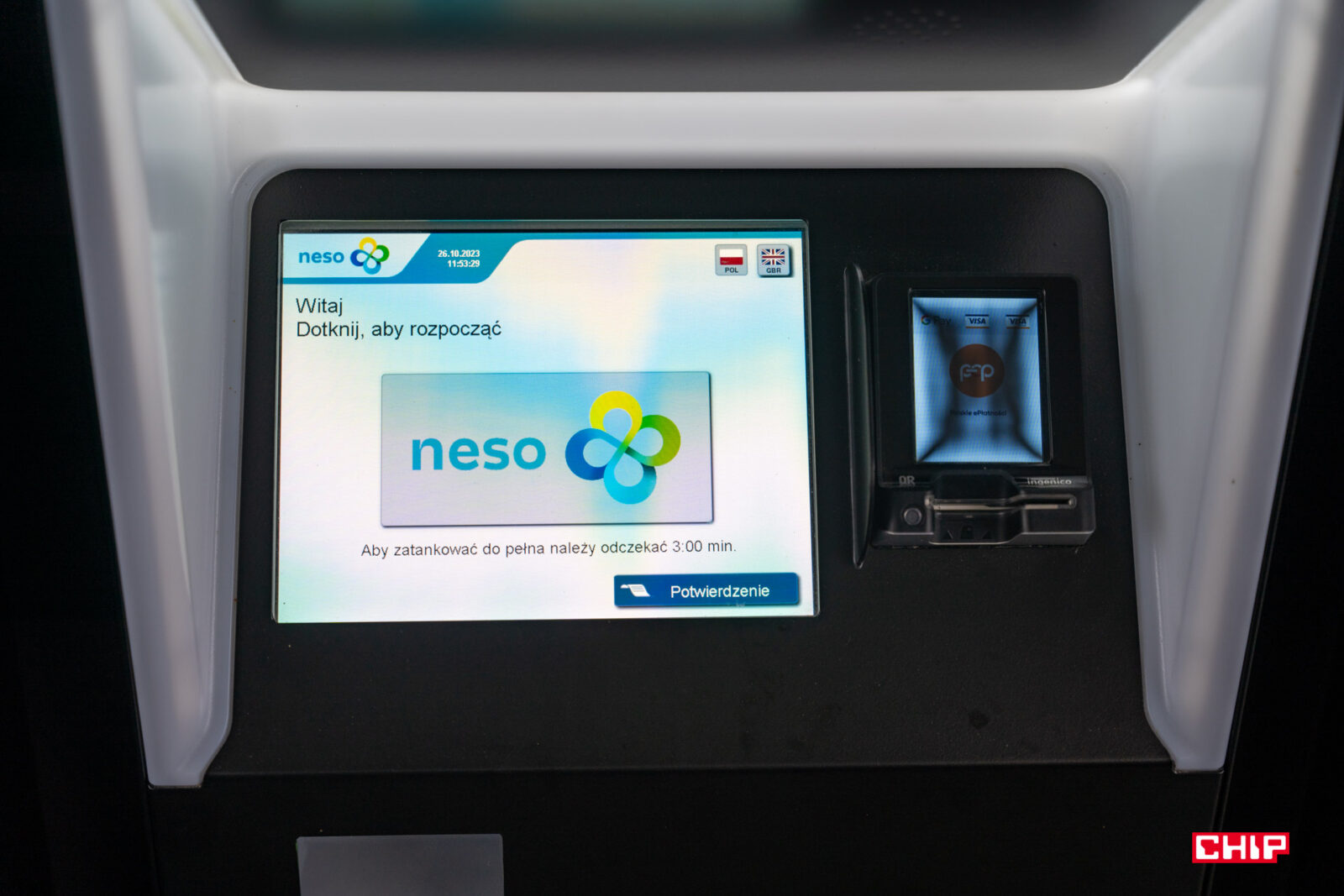 Tankowanie wodoru jest nieporównywalnie prostszą i szybszą czynnością niż ładowania samochodu elektrycznego. Nie słuchajcie bajek elektromagów, że ładowanie auta trwa kilka sekund. Samochód musi odstać przy ładowarce zazwyczaj kilkadziesiąt minut, a do przeprowadzenia całego procesu potrzebujemy albo konta założonego u dostawcy ładowarki, do tego aplikacji na smartfonie lub specjalnej karty powiązanej z kontem. W przypadku stacji tankowania wodorem wygląda do następująco. Najpierw płacimy w specjalnym terminalu: