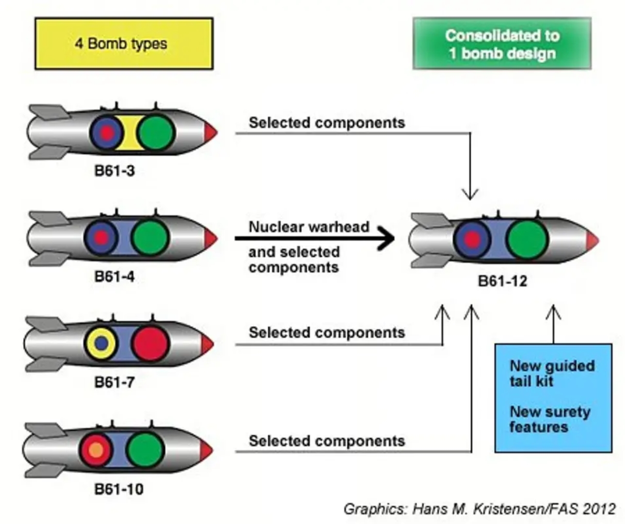 B61 to rodzina bomb jądrowych, które znajdują się w służbie od 1968 roku. B61 została pierwotnie zaprojektowana jako broń taktyczna do użytku w Europie, ale później przekształciła się w broń strategiczną do użytku w różnych scenariuszach. Na przestrzeni lat B61 przeszedł kilka modyfikacji, w wyniku których powstały różne wersje o różnej wydajności i możliwościach. Obecna wersja B61 to B61-12, którą po raz pierwszy wyprodukowano w 2020 roku. Ma ona maksymalną wydajność rzędu 50 kiloton i może być dostosowana do niższej wydajności w zależności od celu i misji. Ta bomba ma również zestaw ogonowy, który czyni go bardziej precyzyjnym i elastycznym, a jej kompatybilność z wieloma samolotami wojskowymi stała się cenną cechą, umożliwiającą B61-12 zastąpienie starszych wersji B61.