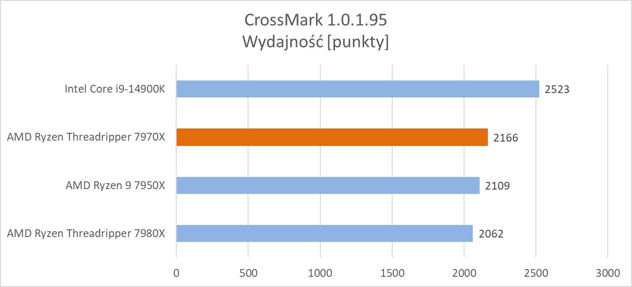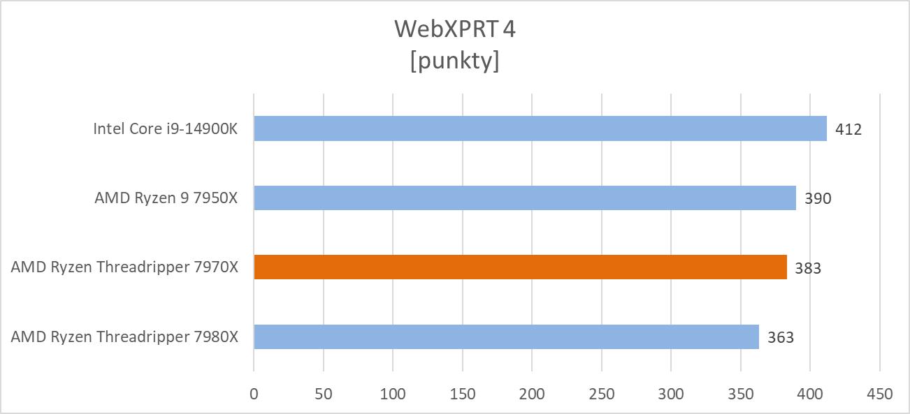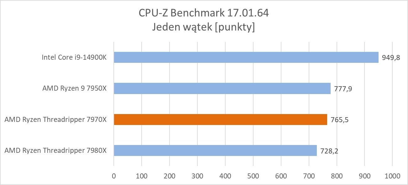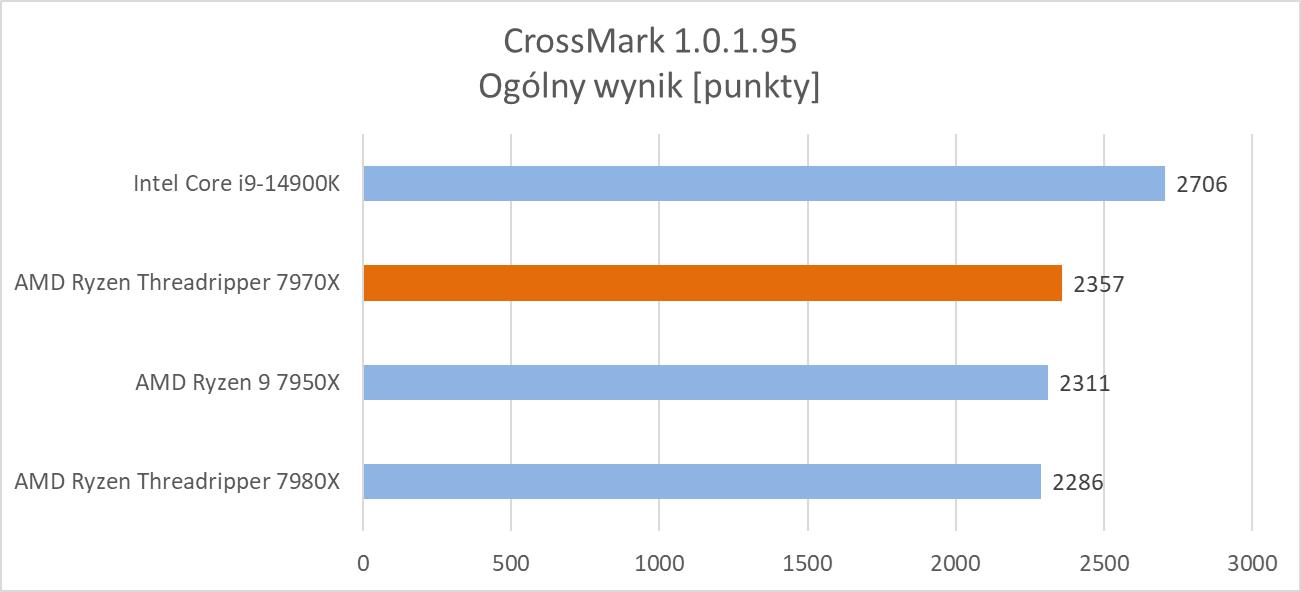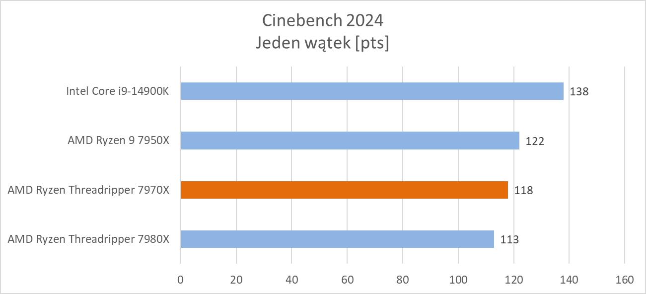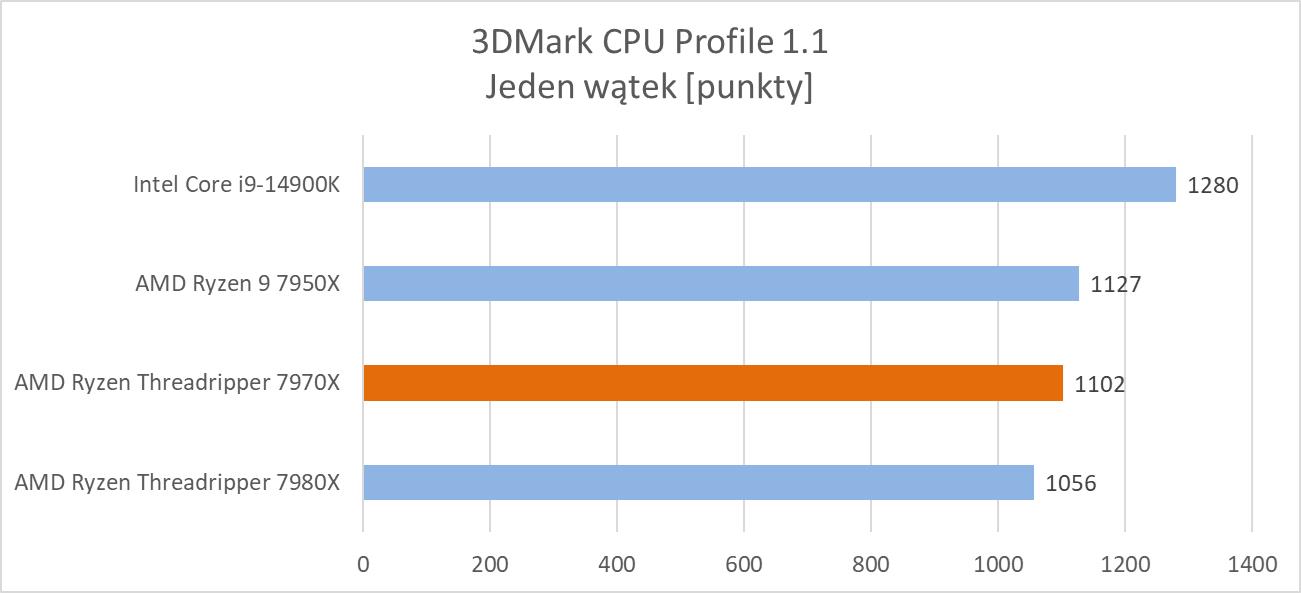 Powyższy wykres to średnia ze wszystkich programów, co jest mocnym uproszczeniem. Przewaga nad i9-14900K jest widoczna, ale nie jest tak duża, jakbyśmy mogli się spodziewać. Natomiast trzeba tutaj dokładnie wniknąć w wyniki, aby zrozumieć sens procesora. AMD Ryzen Threadripper 7970X wypada słabiej w testach jednowątkowych. W Cinebench 2024 strata do i9-14900K wynosi ok. 14,5%, w POV-Ray ok. 15,4%, 3DMarku CPU profile ok. 13,9%, a w CPU-Z ok. 19,4%. Są to jednocześnie wyniki wyższe od 7980X, który ma niższe zegary. Wyniki są też niższe w aplikacjach webowych, gdzie strata np. w WebXPRT 4 do i9-14900K wynosi 9%. Co ciekawe w CrossMarku procesor wygrywa z Ryzenem 9 7950X oraz Threadripperem 7980X, ale w PCMarku konstrukcja jest już najsłabsza w zestawieniu.