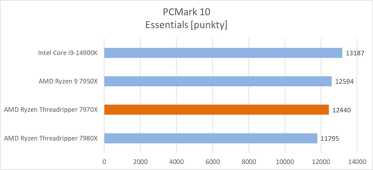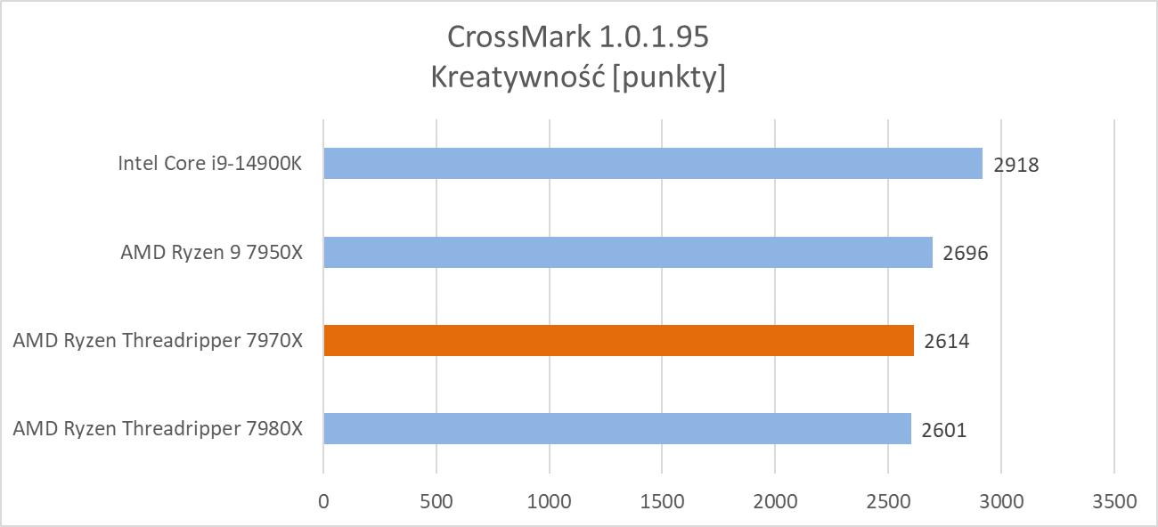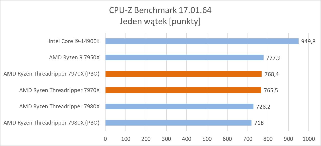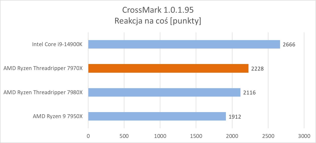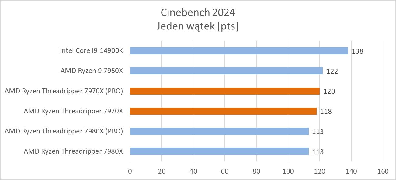 Powyższy wykres to średnia ze wszystkich programów, co jest mocnym uproszczeniem. Przewaga nad i9-14900K jest widoczna, ale nie jest tak duża, jakbyśmy mogli się spodziewać. Natomiast trzeba tutaj dokładnie wniknąć w wyniki, aby zrozumieć sens procesora. AMD Ryzen Threadripper 7970X wypada słabiej w testach jednowątkowych. W Cinebench 2024 strata do i9-14900K wynosi ok. 14,5%, w POV-Ray ok. 15,4%, 3DMarku CPU profile ok. 13,9%, a w CPU-Z ok. 19,4%. Są to jednocześnie wyniki wyższe od 7980X, który ma niższe zegary. Wyniki są też niższe w aplikacjach webowych, gdzie strata np. w WebXPRT 4 do i9-14900K wynosi 9%. Co ciekawe w CrossMarku procesor wygrywa z Ryzenem 9 7950X oraz Threadripperem 7980X, ale w PCMarku konstrukcja jest już najsłabsza w zestawieniu.