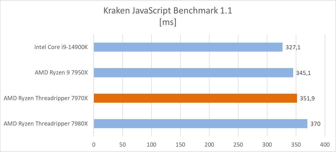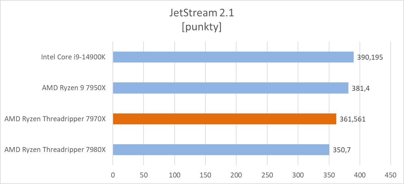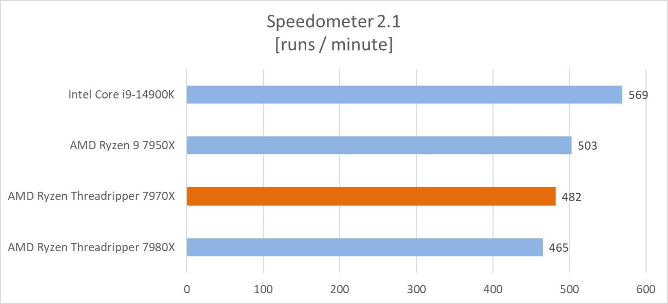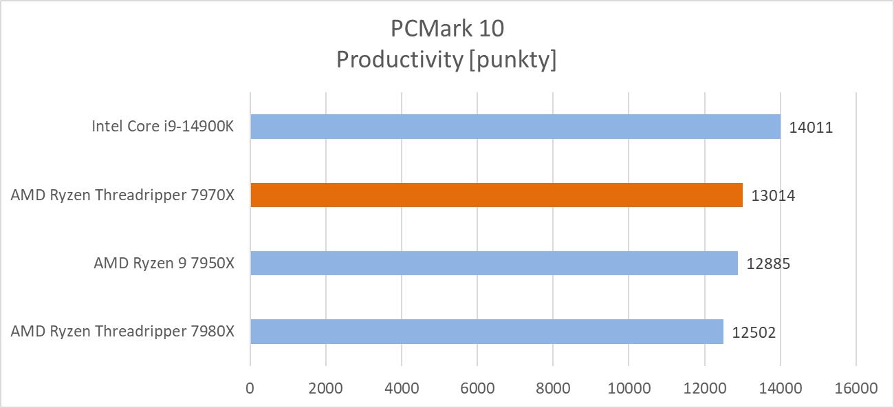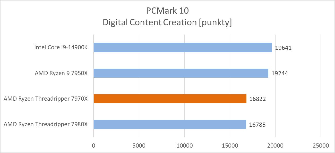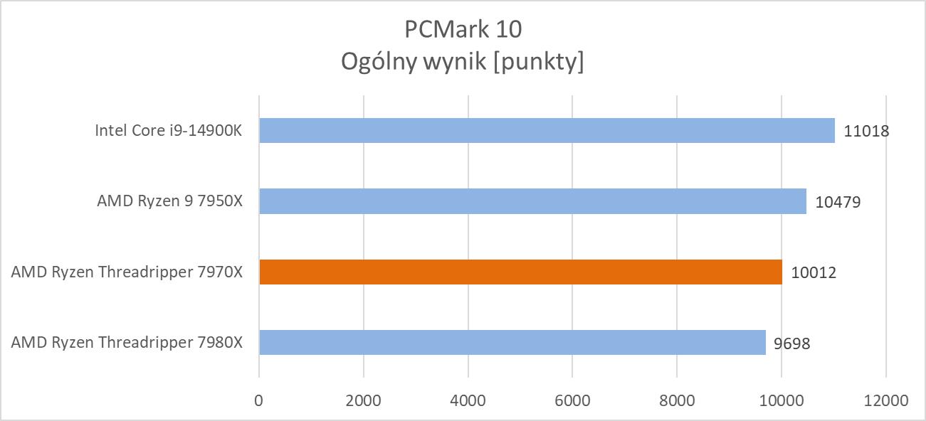 Powyższy wykres to średnia ze wszystkich programów, co jest mocnym uproszczeniem. Przewaga nad i9-14900K jest widoczna, ale nie jest tak duża, jakbyśmy mogli się spodziewać. Natomiast trzeba tutaj dokładnie wniknąć w wyniki, aby zrozumieć sens procesora. AMD Ryzen Threadripper 7970X wypada słabiej w testach jednowątkowych. W Cinebench 2024 strata do i9-14900K wynosi ok. 14,5%, w POV-Ray ok. 15,4%, 3DMarku CPU profile ok. 13,9%, a w CPU-Z ok. 19,4%. Są to jednocześnie wyniki wyższe od 7980X, który ma niższe zegary. Wyniki są też niższe w aplikacjach webowych, gdzie strata np. w WebXPRT 4 do i9-14900K wynosi 9%. Co ciekawe w CrossMarku procesor wygrywa z Ryzenem 9 7950X oraz Threadripperem 7980X, ale w PCMarku konstrukcja jest już najsłabsza w zestawieniu.